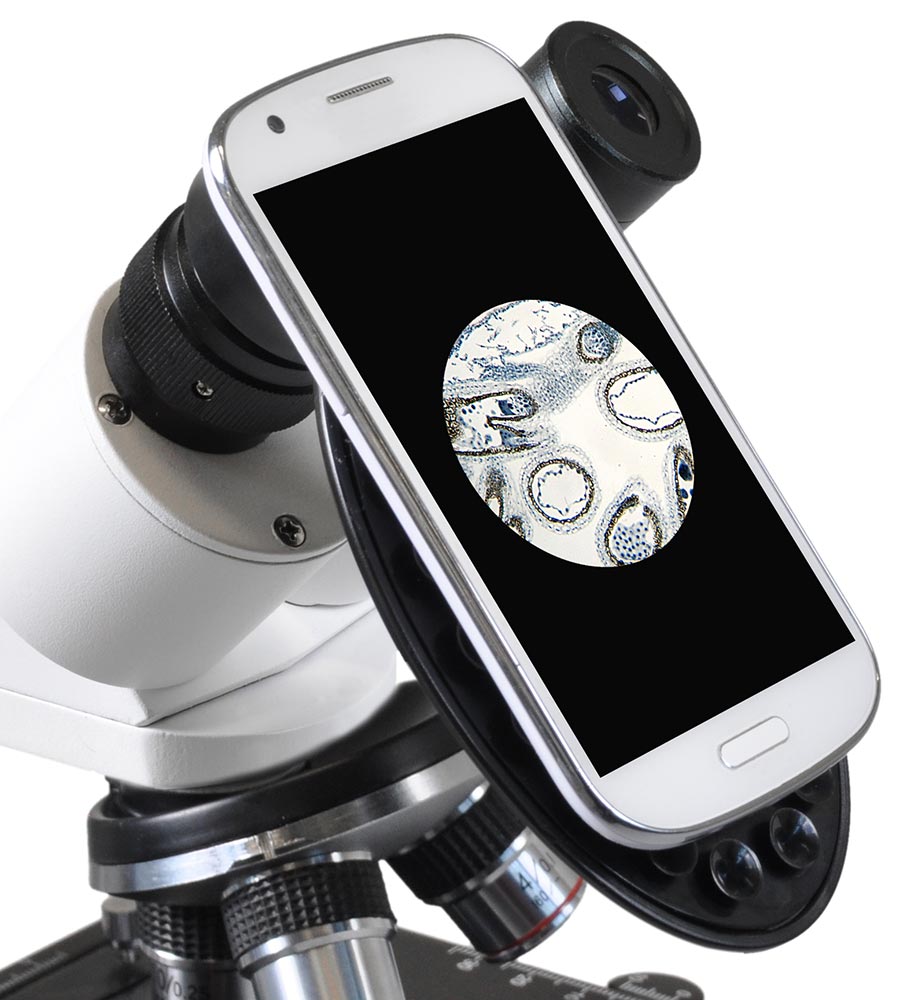 Для питания подсветки используются батарейки, поэтому микроскоп идеально подходит для экспедиций, научных исследований вне дома, занятий в кружках или школе. А при помощи комплектного адаптера на микроскопе можно фиксировать смартфон, чтобы снимать на его камеру все свои наблюдения.