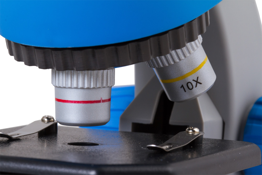 Маленький ученый сможет изучать микромир на увеличении от 40 до 640 крат. В револьверное устройство микроскопа уже установлены три объектива 4х, 10х и 40х. Окуляр можно установить в одно из положений – 10х или 16х. Смену кратности легко проводить прямо во время наблюдения, лишь корректируя резкость вращением ручки фокусировки.