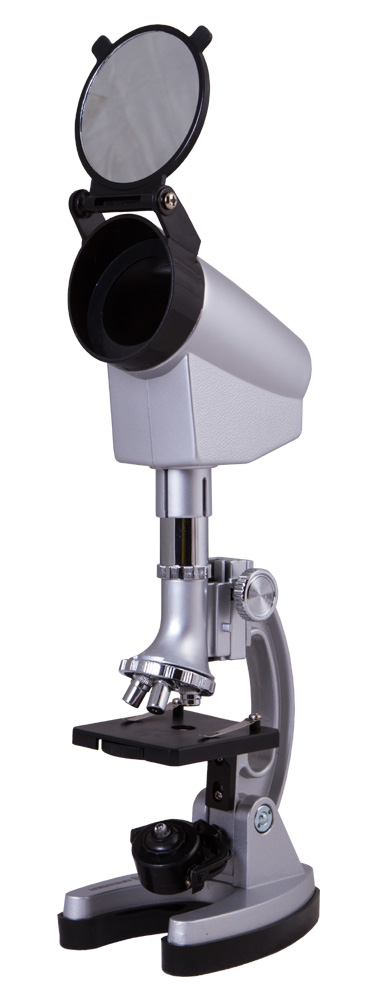 Осветительная система микроскопа состоит из зеркала и галогенной лампы. Они расположены по двум сторонам вращающегося диска, поэтому вы легко сможете выбрать подходящий для ситуации тип освещения. Зеркало подойдет для наблюдений при хорошем внешнем освещении, лампа пригодится при недостаточности дневного или искусственного света. Подсветка работает от батареек (нет в комплекте), что позволяет использовать микроскоп даже вдали от электрической сети, например на природе.