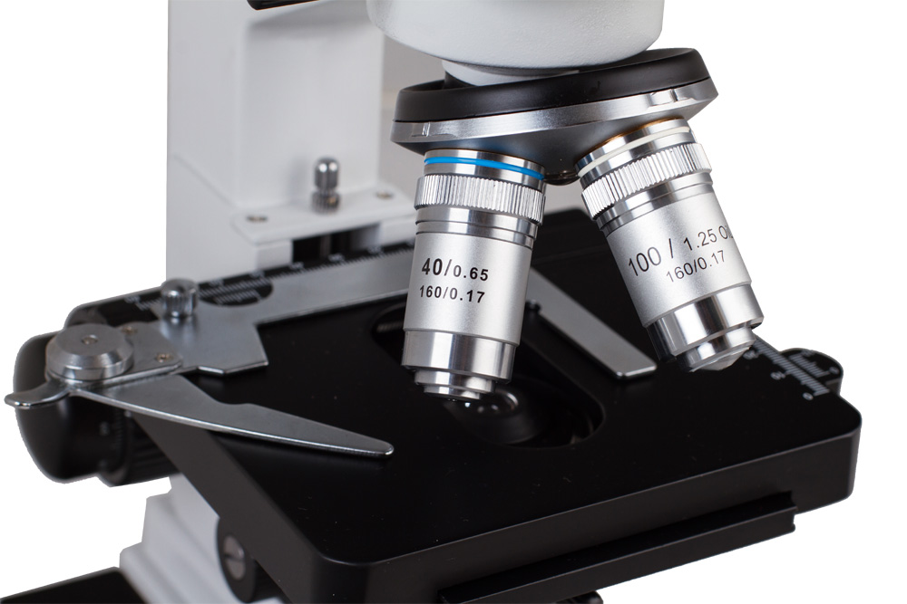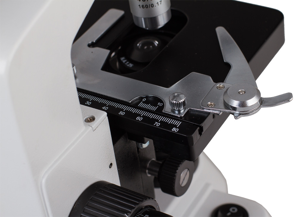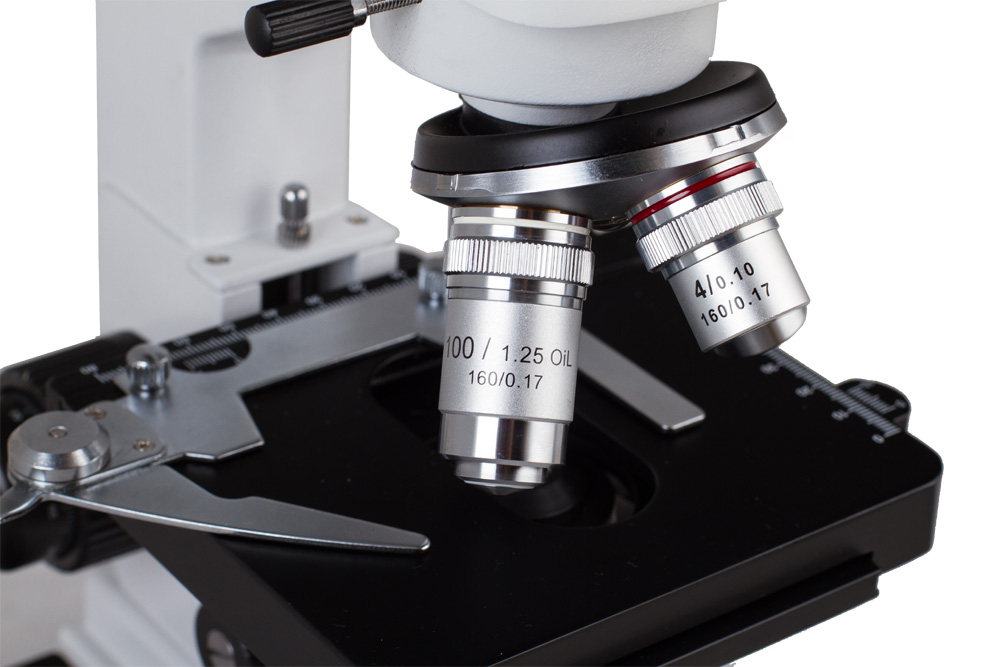 Предметный столик с нониусом снабжен препаратоводителем, ручки грубой и тонкой фокусировки обеспечивают максимально точное позиционирование объекта под объективом микроскопа. Револьверное устройство на 4 объектива и комплектные окуляры 10x обеспечивают увеличения от 40 до 1000 крат. 100-кратный объектив позволяет проводить наблюдения по методу масляной иммерсии.