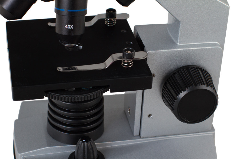 Предметный столик микроскопа снабжен зажимами для закрепления микропрепаратов. Он подвижный, что позволяет рассматривать большие микропрепараты, не передвигая их по столику.