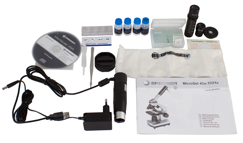 Цифровой микроскоп Bresser Junior 40x-1024x – отличныйподарок для любого юного исследователя. Высокое качество изготовления и сборки механических частей, стеклянная просветленная оптика, богатая комплектация, которая включает все необходимое для работы с микроскопом и изготовления собственных микропрепаратов – и все это по доступной цене. Микроскоп может использоваться для изучения микропрепаратов в проходящем и отраженном свете.