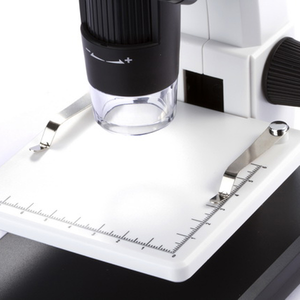 Предметный столик имеет измерительную шкалу (8 см по оси x, 6 см по оси y) и два зажима для закрепления образца под камерой.