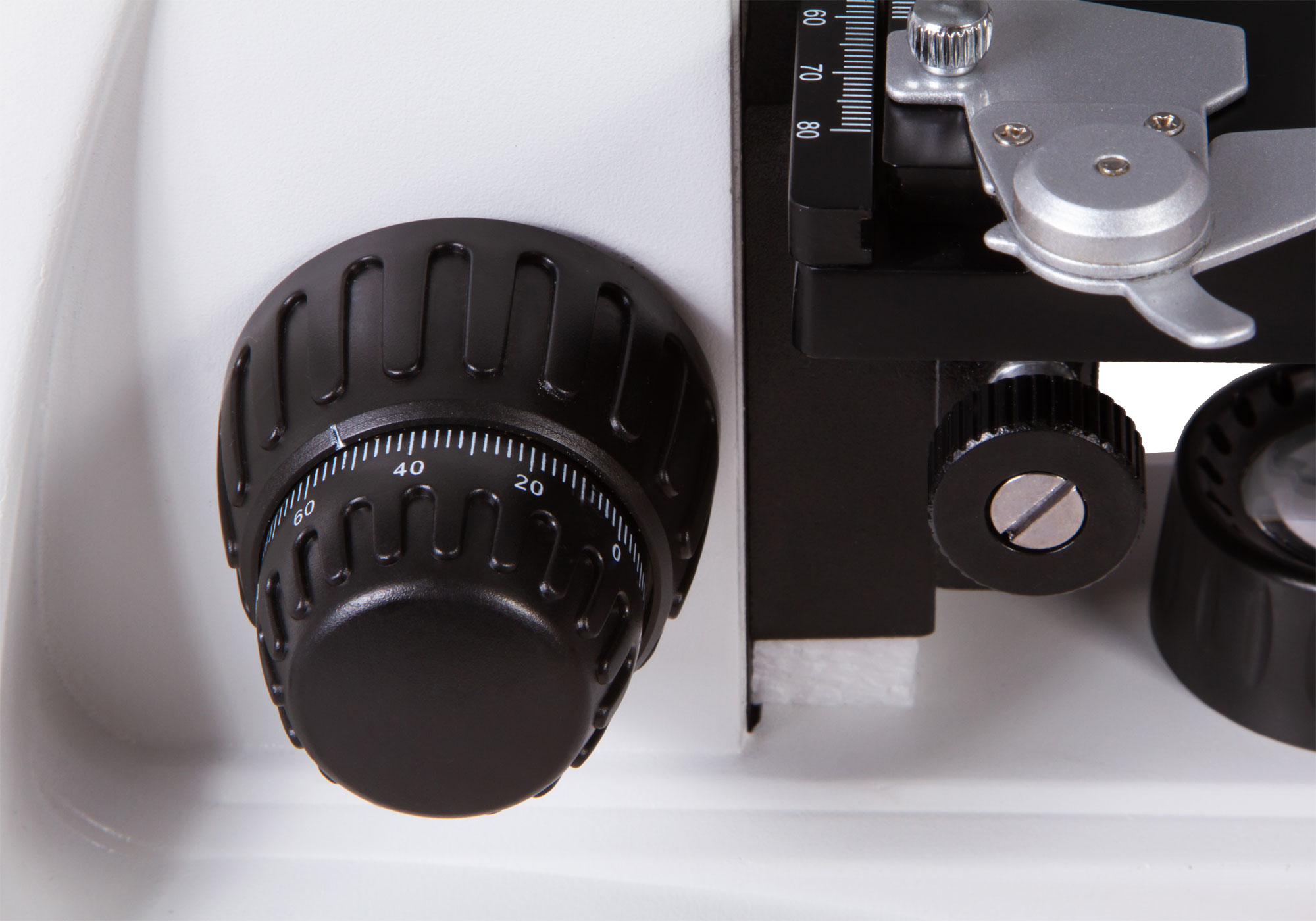 Предметный столик можно перемещать по двум направлениям, кроме того, он снабжен препаратоводителем. Под ним находится осветительная система микроскопа. Она состоит из яркого 5-ваттного светодиода и конденсора Аббе с ирисовой диафрагмой и держателем фильтра (три светофильтра входят в комплект поставки). Подсветка работает от сети переменного тока. Яркость подсветки можно регулировать. Для настройки резкости используются грубая и точная фокусировки.