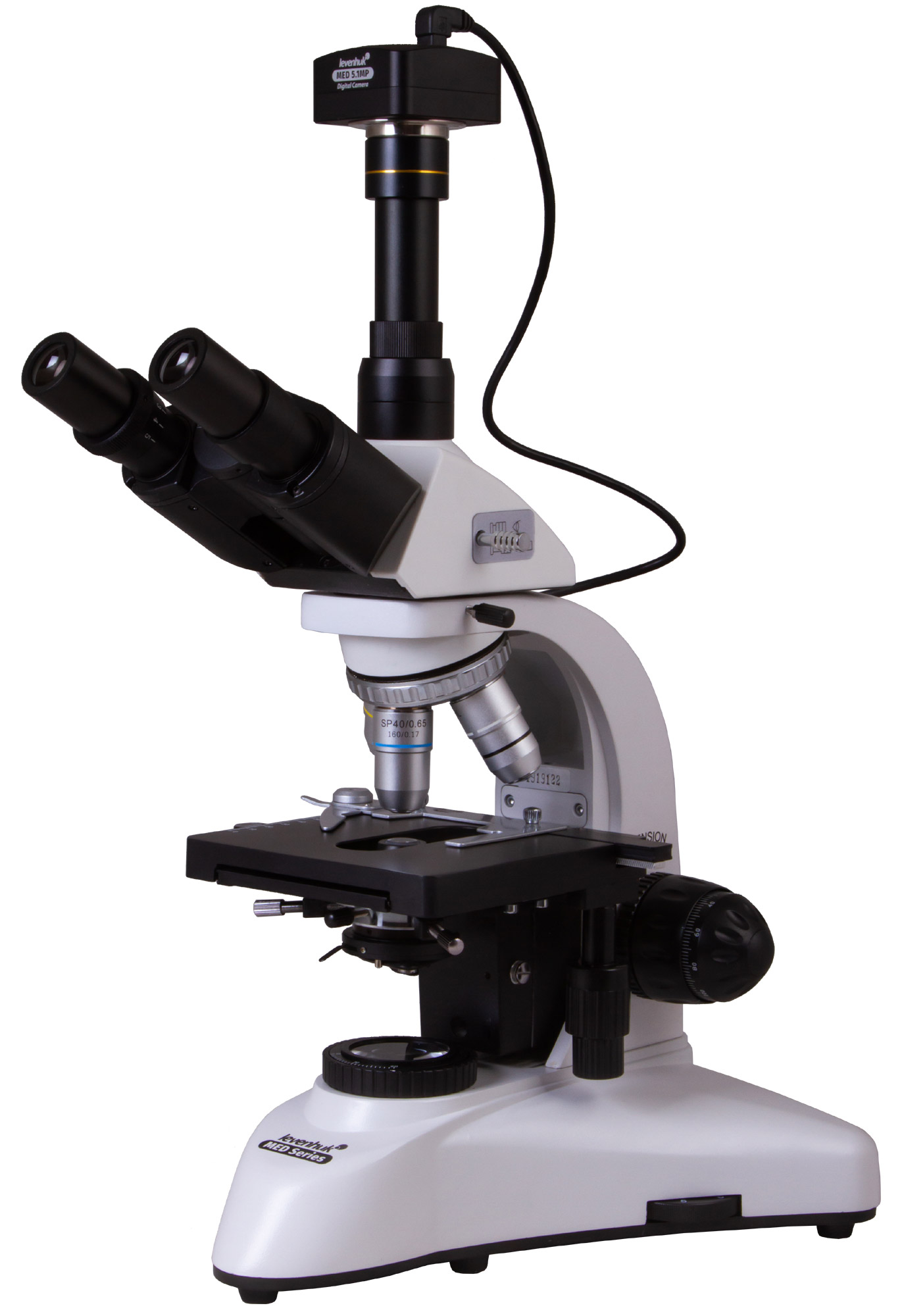 В микроскопе используется классическая тринокулярная насадка. Она разделена на визуальную часть, отклоненную на 30-градусный угол, и отдельную вертикальную трубку, в которую устанавливается цифровая камера (в комплекте). Есть делитель светового потока. Камера снабжена сенсором 5,1 Мпикс, позволяет снимать фото и записывать видео. Ее можно соединить с внешним устройством при помощи комплектного USB-кабеля, чтобы передавать картинку с объектива микроскопа на подключенный экран в реальном времени. Камера облегчает работу в лаборатории, так как благодаря ей нет нужды постоянно смотреть в окуляры. С помощью специальной программы, записанной на диск, можно корректировать размер, яркость и контрастность изображения, менять время выдержки, проводить калибровку камеры с объективами, измерять образцы или отдельные структуры (доступно несколько единиц измерения).