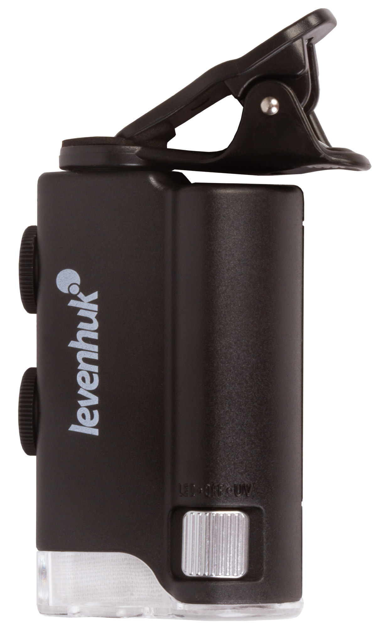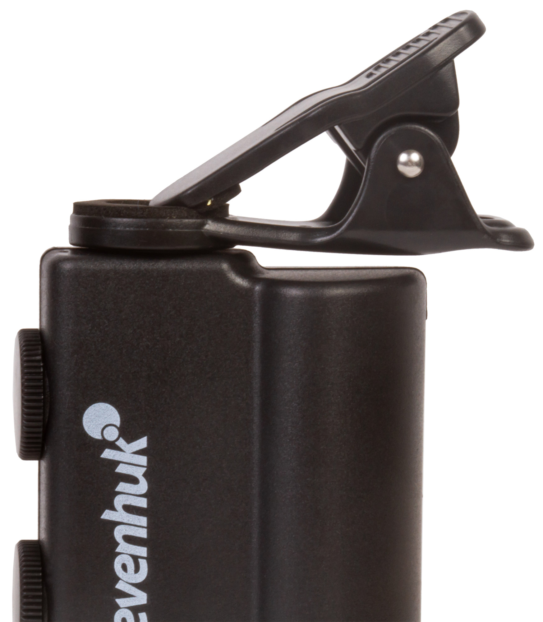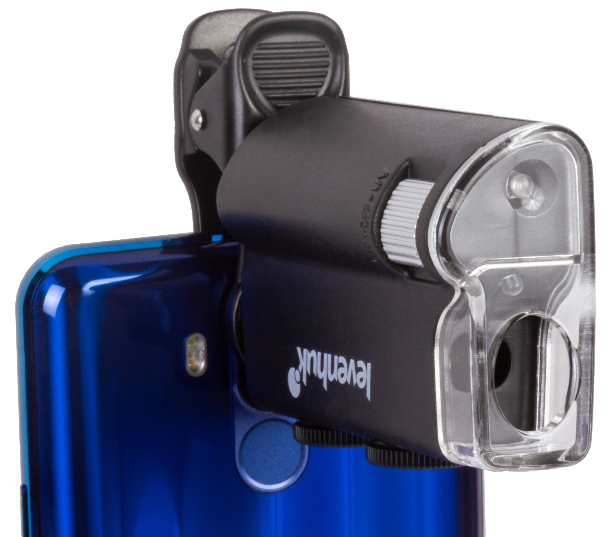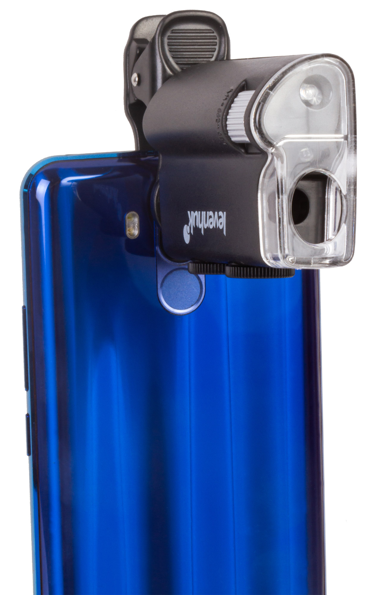 Микроскоп можно фиксировать на мобильном телефоне при помощи комплектного зажима. Если расположить его прямо напротив камеры смартфона, ее получится использовать для фотографирования и видеозаписи. Картинка с объектива микроскопа при этом будет выводиться прямо на экран мобильного устройства. Так как кроме ультрафиолетовой подсветки в Levenhuk Zeno Cash ZC10 есть и светодиодная, он может брать на себя функцию мощной лупы с плавно изменяемым увеличением.