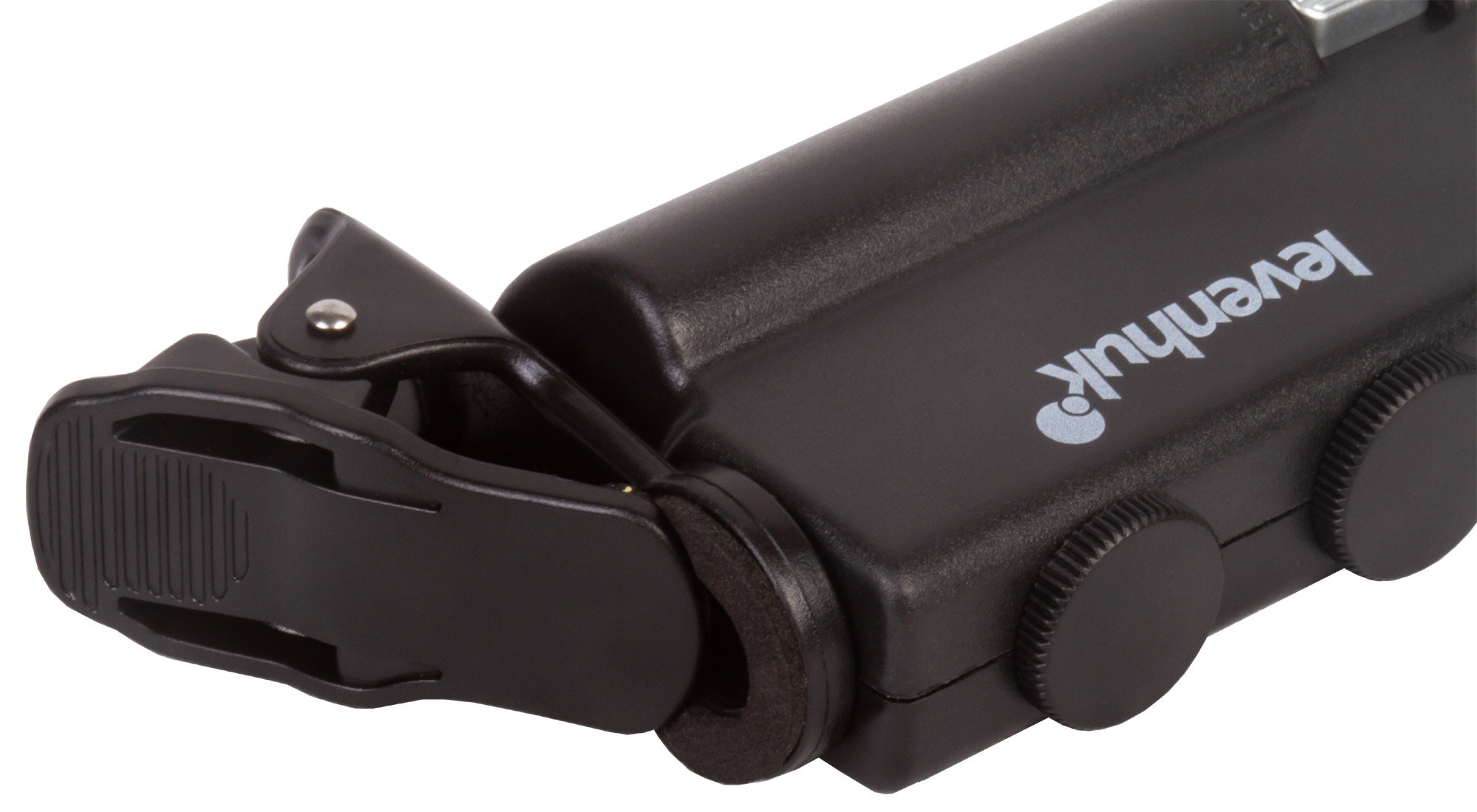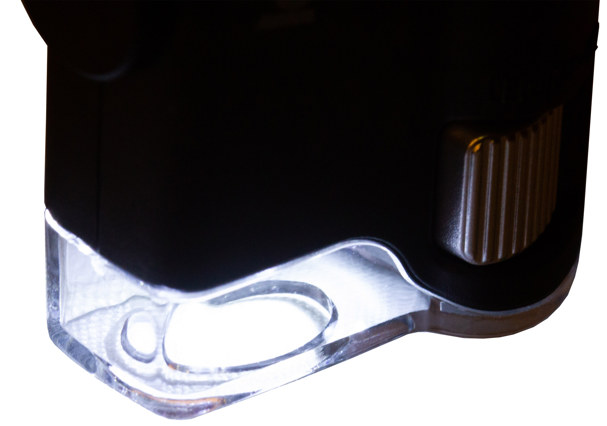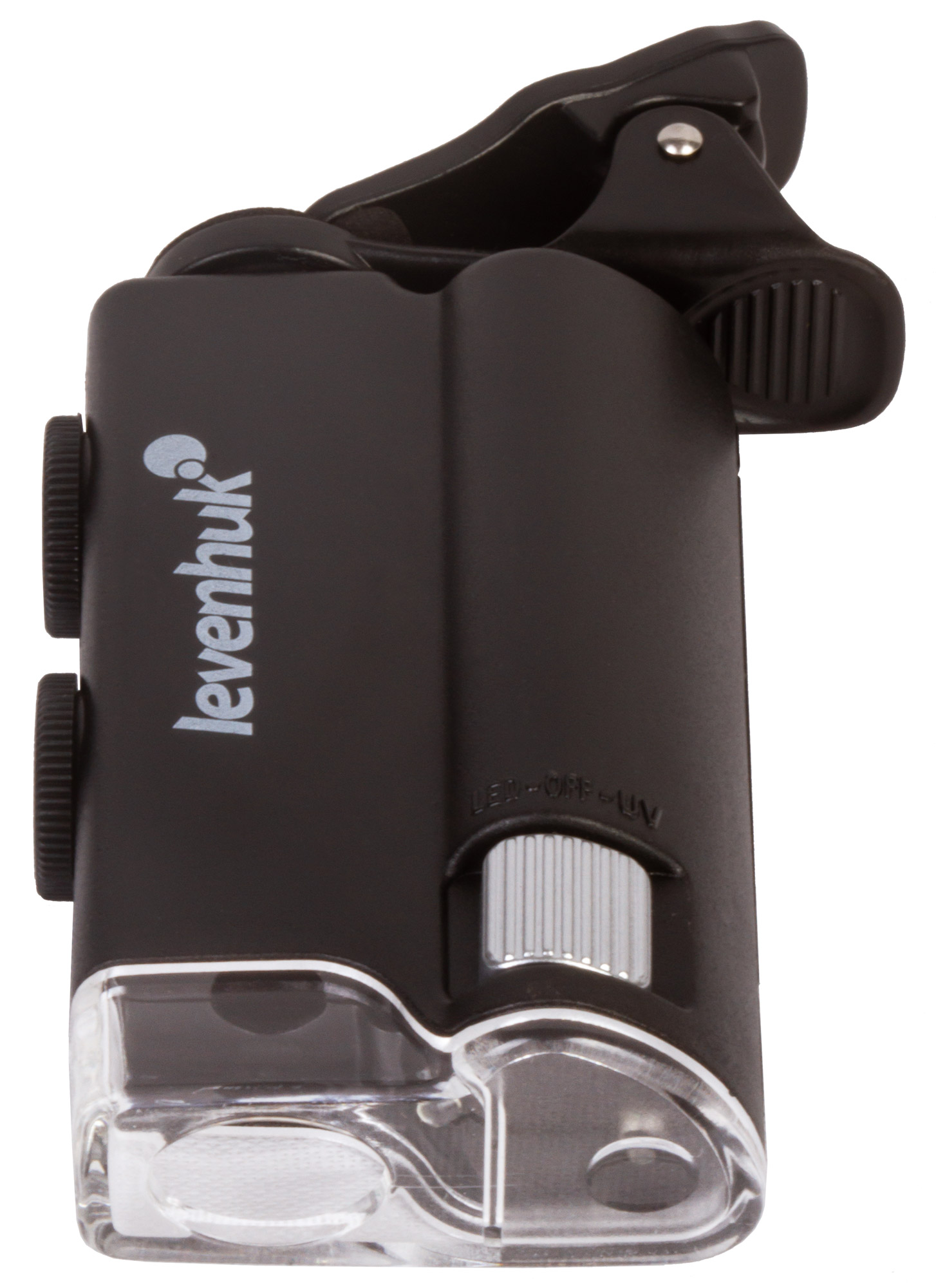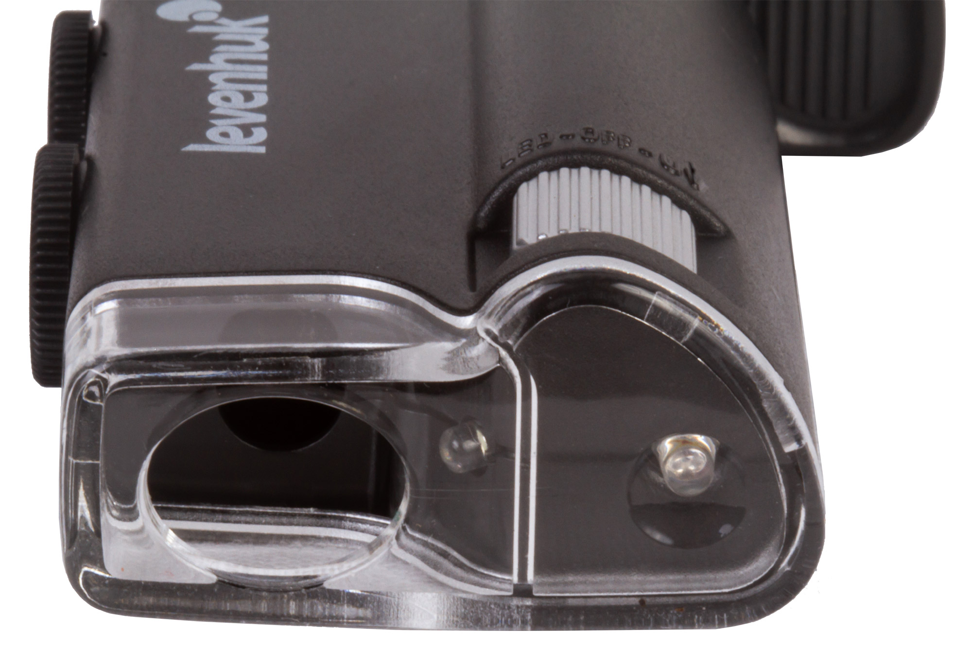 Микроскоп можно фиксировать на мобильном телефоне при помощи комплектного зажима. Если расположить его прямо напротив камеры смартфона, ее получится использовать для фотографирования и видеозаписи. Картинка с объектива микроскопа при этом будет выводиться прямо на экран мобильного устройства. Так как кроме ультрафиолетовой подсветки в Levenhuk Zeno Cash ZC10 есть и светодиодная, он может брать на себя функцию мощной лупы с плавно изменяемым увеличением.