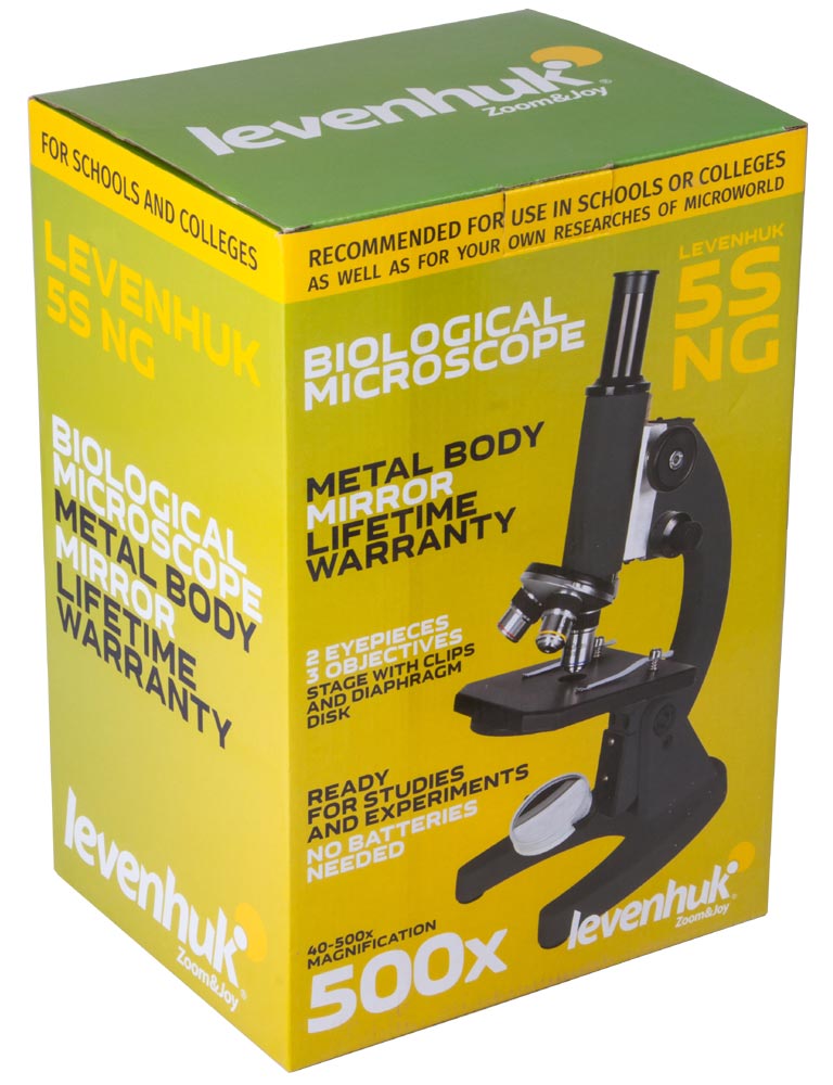 Монокулярный микроскоп Levenhuk 5S NG – простой и надежный оптический прибор, который станет хорошим помощником ребенку в учебе и научном хобби. Диапазон его увеличений составляет от 40 до 500 крат, что позволяет подробно изучать готовые микропрепараты и простейших одноклеточных – амеб, инфузорий, эвглен. Микроскопом легко управлять, поэтому ребенок сможет проводить все исследования без помощи взрослых. Так как в микроскопе используется простая подсветка-зеркало, для ее работы не требуется дополнительное питание – такая конструкция исключает контакт с электричеством.