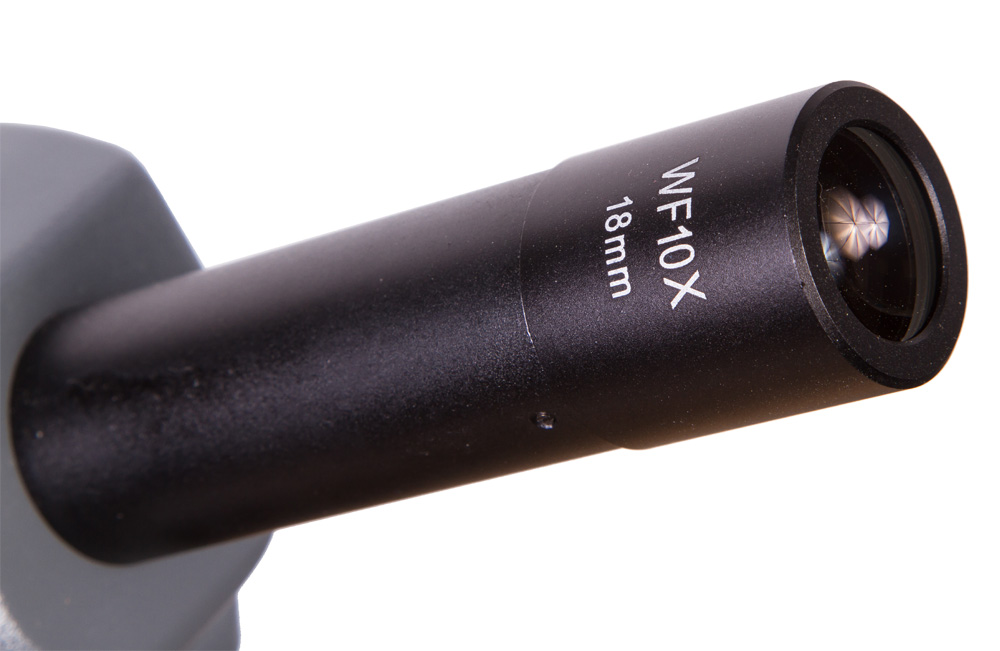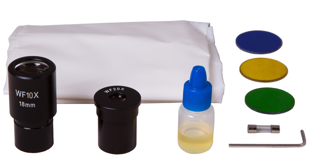 Микроскоп имеет револьверное устройство на 4 объектива. В комплекте идут ахроматические объективы разной кратности, один из них – иммерсионный. Применение иммерсионного масла позволяет значительно усиливать яркость рассматриваемых образцов и расширять пределы увеличения изображения. Два окуляра – широкоугольный с 10-кратным увеличением и 20-кратный окуляр Гюйгенса с широким полем зрения – прекрасно дополняют друг друга и позволяют проводить широкий спектр визуальных наблюдений. Общий диапазон увеличений микроскопа составляет от 40х до 2000х.