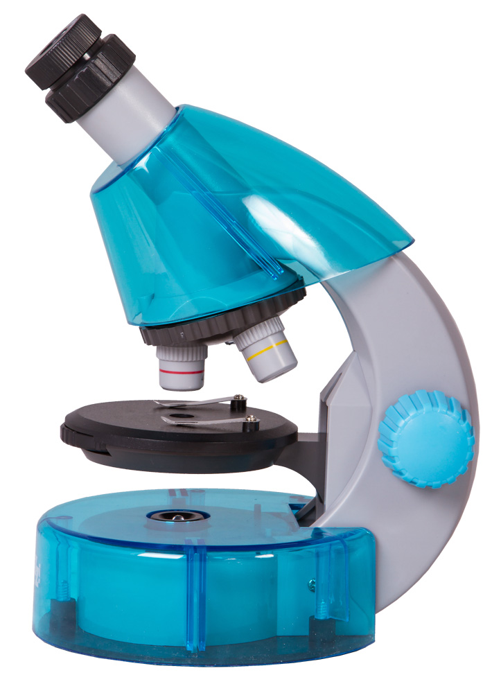Levenhuk LabZZ M101 Azure\Лазурь – это детский микроскоп с полноценной «взрослой» конструкцией. Эта модель снабжена тремя объективами: 4x, 10x, 40x. Для смены объектива достаточно повернуть револьверное устройство. Особый выдвижной двухпозиционный окуляр позволяет заменить два обычных окуляра с увеличениями 10 и 16 крат. Ребенку не придется менять окуляры, так что он не потеряет их. Пользоваться окуляром просто и удобно. Микроскоп дает шесть степеней увеличения: 40, 64, 100, 160, 400 и 640 крат.