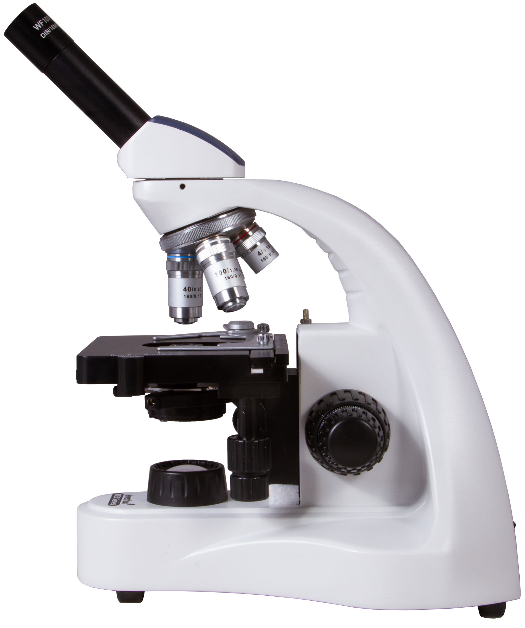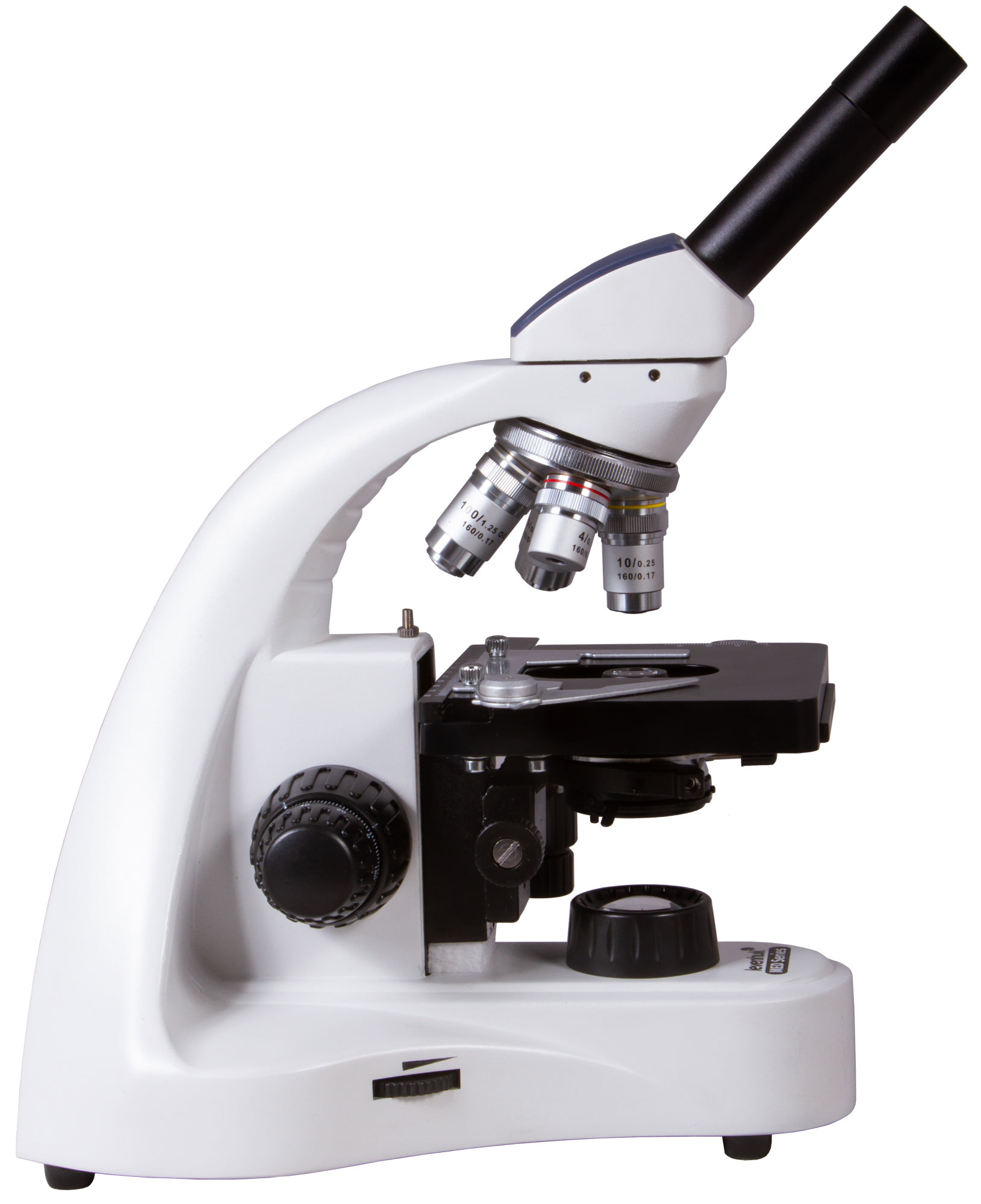 В микроскопе установлена монокулярная насадка, которая имеет удобный наклон в 45°, что делает длительные наблюдения более комфортными. Так как ее можно поворачивать на 360°, микроскоп удобно использовать при групповых исследованиях. В оптической схеме используются ахроматические элементы с антигрибковым покрытием. Слой защитного материала присутствует и на объективах, и на окуляре. В револьверное устройство установлены четыре объектива, два из них – с пружинящими оправами. 100-кратный объектив можно использовать для наблюдений иммерсионным методом (флакон с маслом включен в комплект поставки). Окуляр обеспечивает хороший обзор и имеет диоптрийную коррекцию.