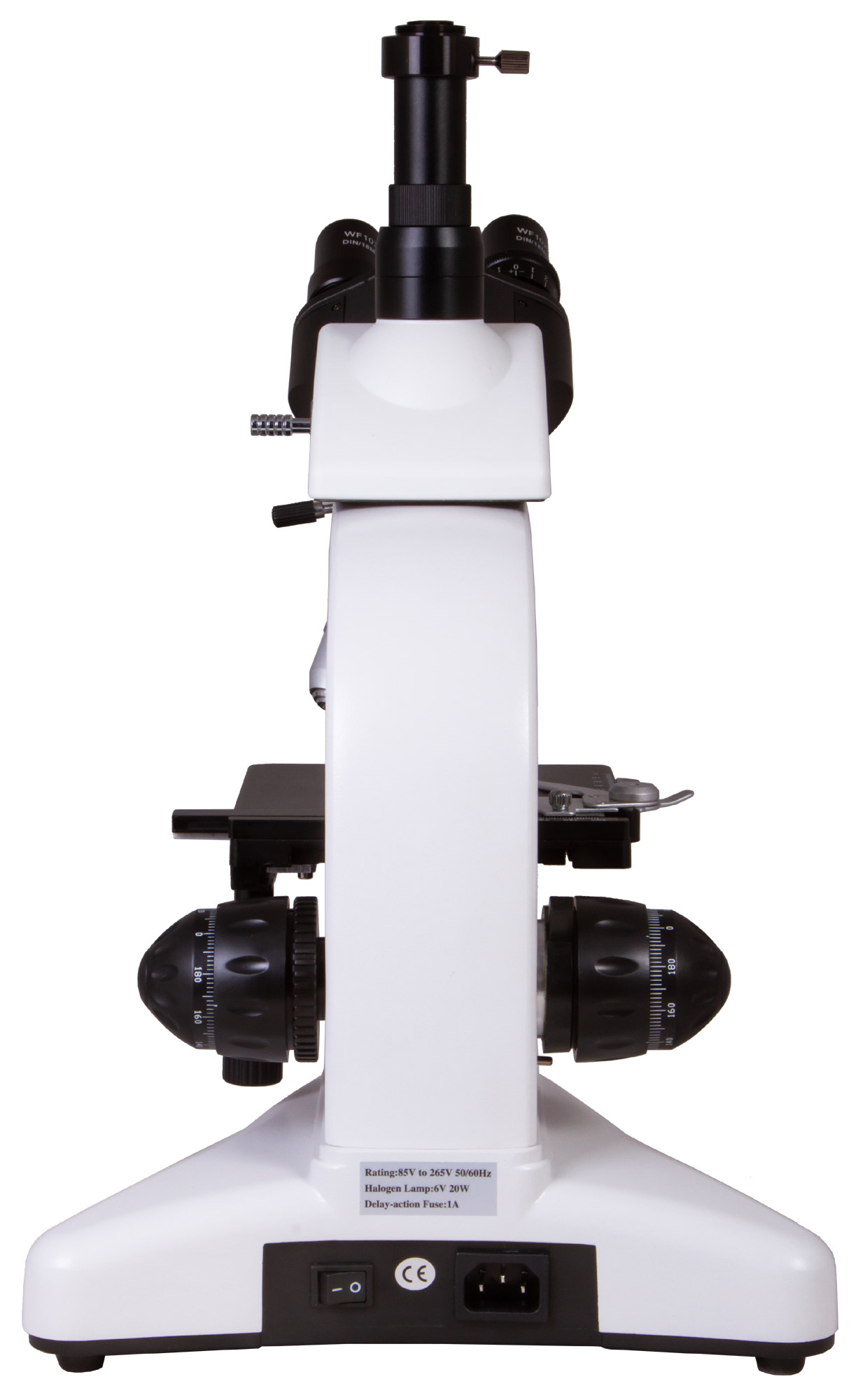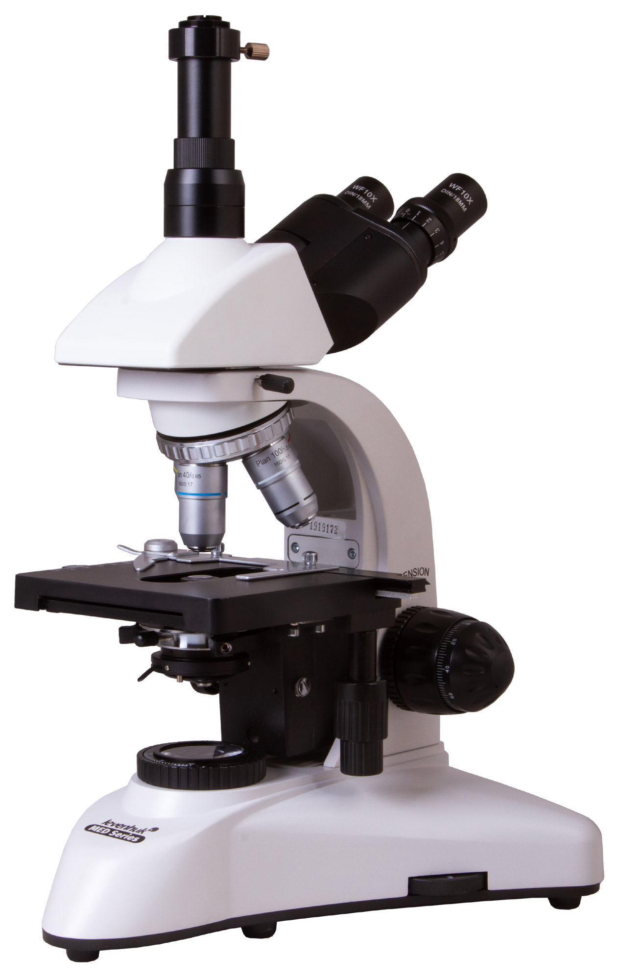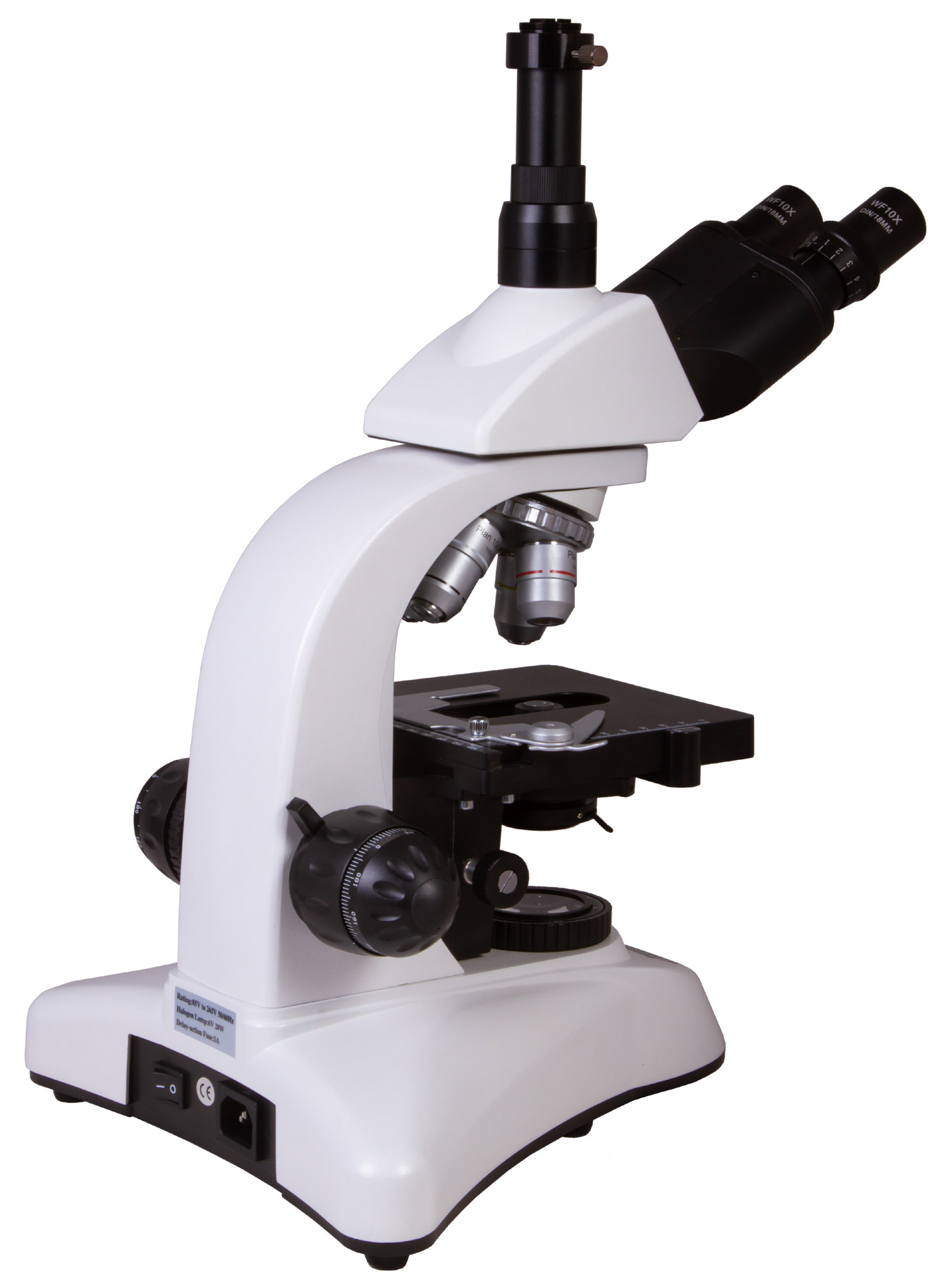 Тринокулярная насадка состоит из визуальной части и отдельной окулярной трубки, в которую можно устанавливать цифровую камеру (приобретается отдельно). Благодаря тому, что ее можно поворачивать на 360°, микроскоп удобно использовать при групповых исследованиях. Угол наклона насадки составляет 30°. Есть делитель светового потока. В комплект поставки включены широкопольные окуляры с 10-кратным увеличением. У них есть диоптрийная коррекция, которая помогает адаптировать оптику под особенности зрения пользователя. Револьверное устройство вмещает четыре планахроматических объектива разной кратности, которые снижают хроматические искажения и создают практически плоское поле. Два из них имеют пружинящие оправы. 100-кратный объектив позволяет вести наблюдения с применением масляной иммерсии. Обратите внимание: оптика защищена антигрибковым покрытием.