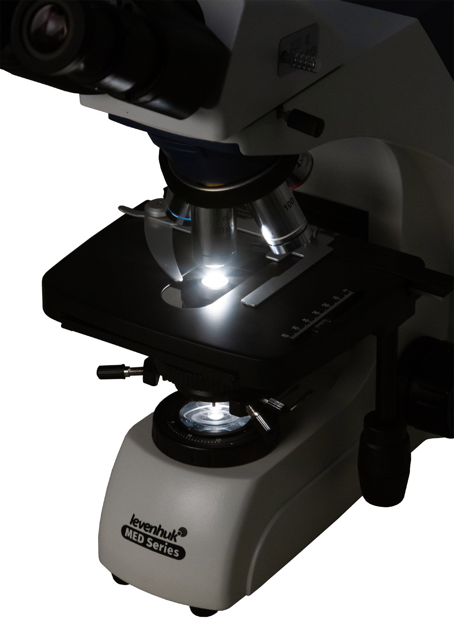 Под визуальным блоком находится предметный столик с препаратоводителем. Образцы освещаются снизу галогенной подсветкой мощностью 30 Вт. Свет проходит через конденсор Аббе, в котором установлена ирисовая диафрагма. В специальном держателе можно фиксировать светофильтры (три фильтра уже включены в комплект поставки).