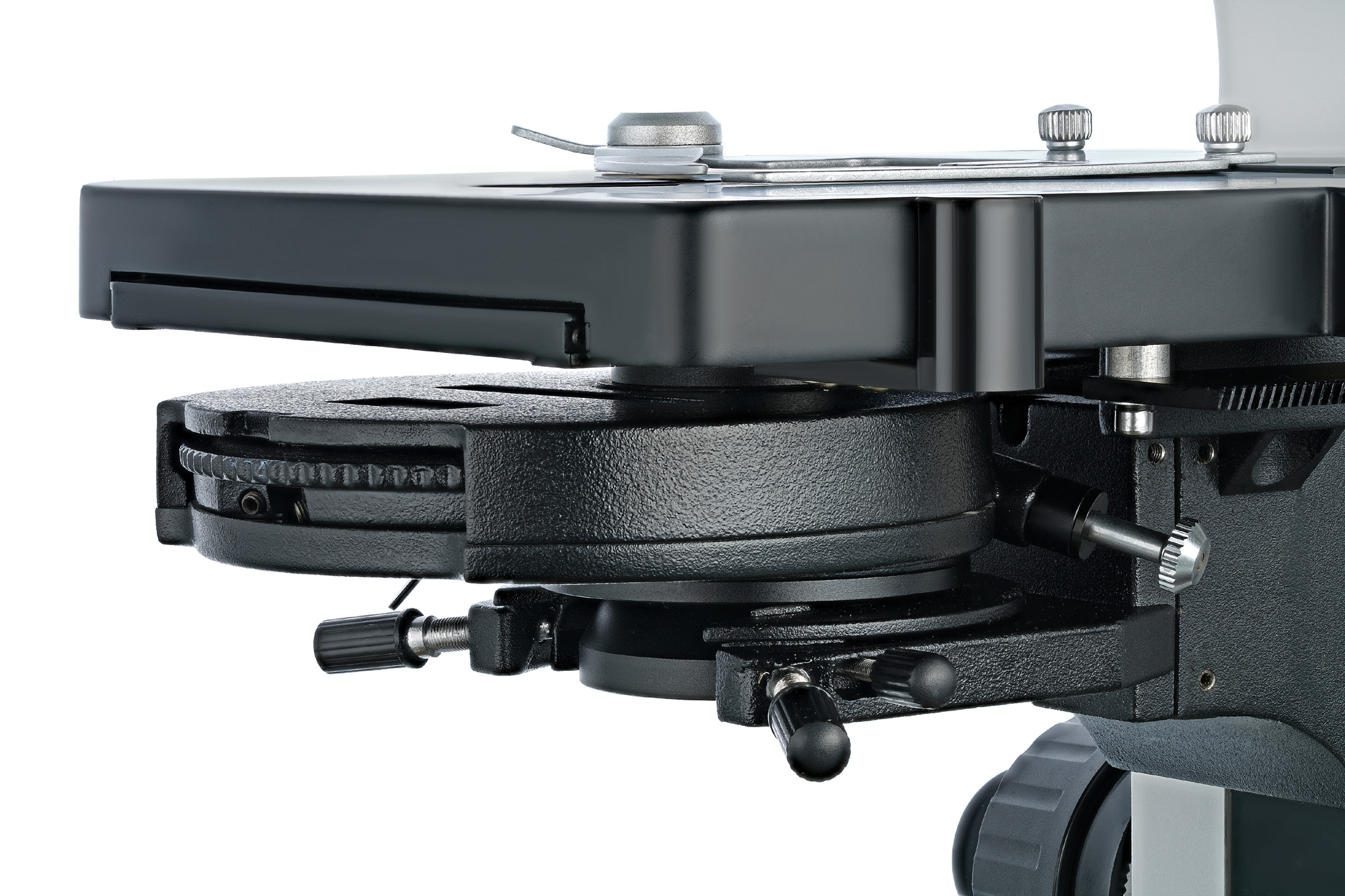 У предметного столика есть препаратоводитель. Столик можно перемещать по двум направлениям. Фазовый конденсор используется только для наблюдений «сухим» методом. Подсветка расположена внизу. Она представляет собой светодиод мощностью 5 Вт, яркость которого можно регулировать. Настройка резкости производится при помощи ручек грубой и точной фокусировки.