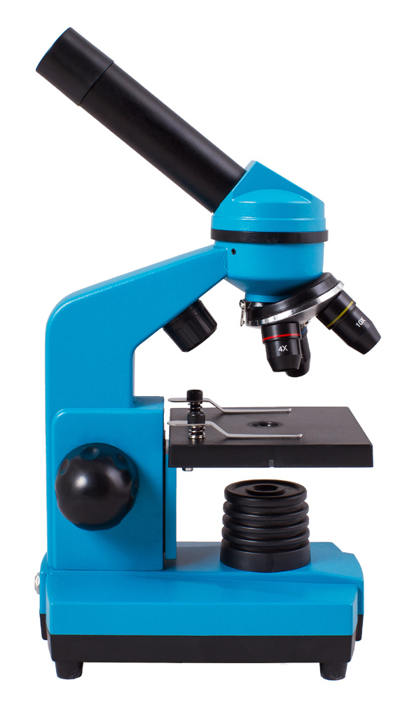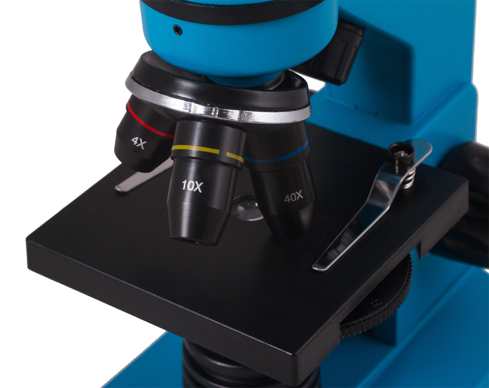 Линзы сделаны из оптического стекла высокой прозрачности. Для лучшего светопропускания оптические поверхности покрыты просветляющим составом – благодаря этому изображение получается четким и контрастным. Микроскоп поставляется с тремя объективами, с которыми можно получить увеличение от 40 до 400 крат. Чтобы сменить кратность, нужно просто повернуть револьверное устройство.