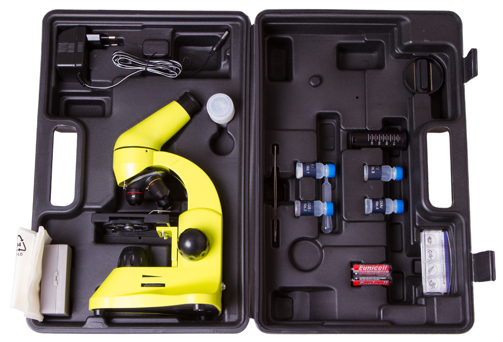 Чтобы части микроскопа не потерялись и не сломались при хранении и переноске, прибор поставляется в прочном пластиковом кейсе. Кейс надежно защищает микроскоп от повреждений и пыли.