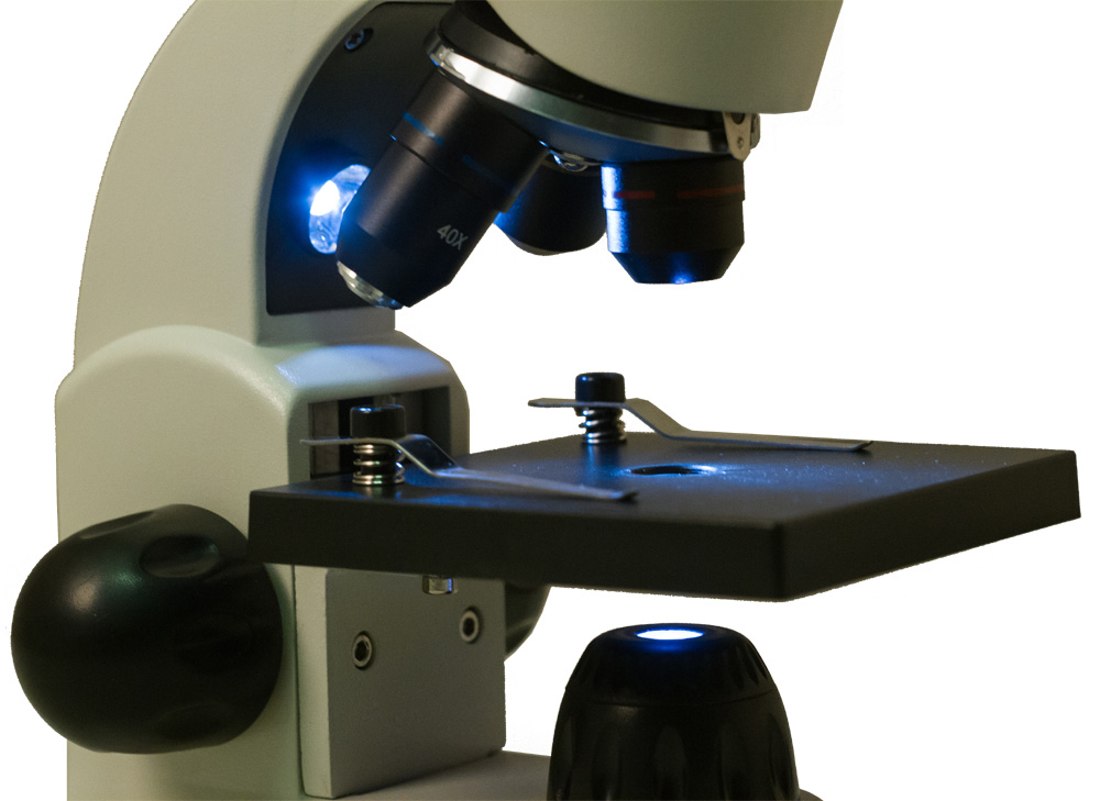 Микроскоп снабжен двумя яркими светодиодными осветителями. Нижняя подсветка нужна для изучения прозрачных препаратов, например артемий в воде из аквариума или тончайших срезов растений. Чтобы разглядеть непрозрачные препараты (микроскопические волокна бумаги или структуру камня), используется верхний осветитель. Прибор позволяет исследовать и полупрозрачные образцы – для этого включите обе подсветки одновременно. Для каждого препарата легко подобрать подходящий уровень освещения – яркость регулируется.