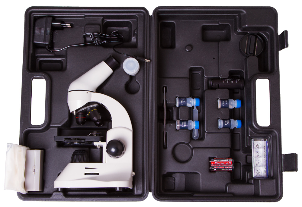 Микроскоп поставляется в надежном пластиковом кейсе. При транспортировке в кейсе части прибора не сломаются и не потеряются. Кроме того, кейс защищает микроскоп от пыли.