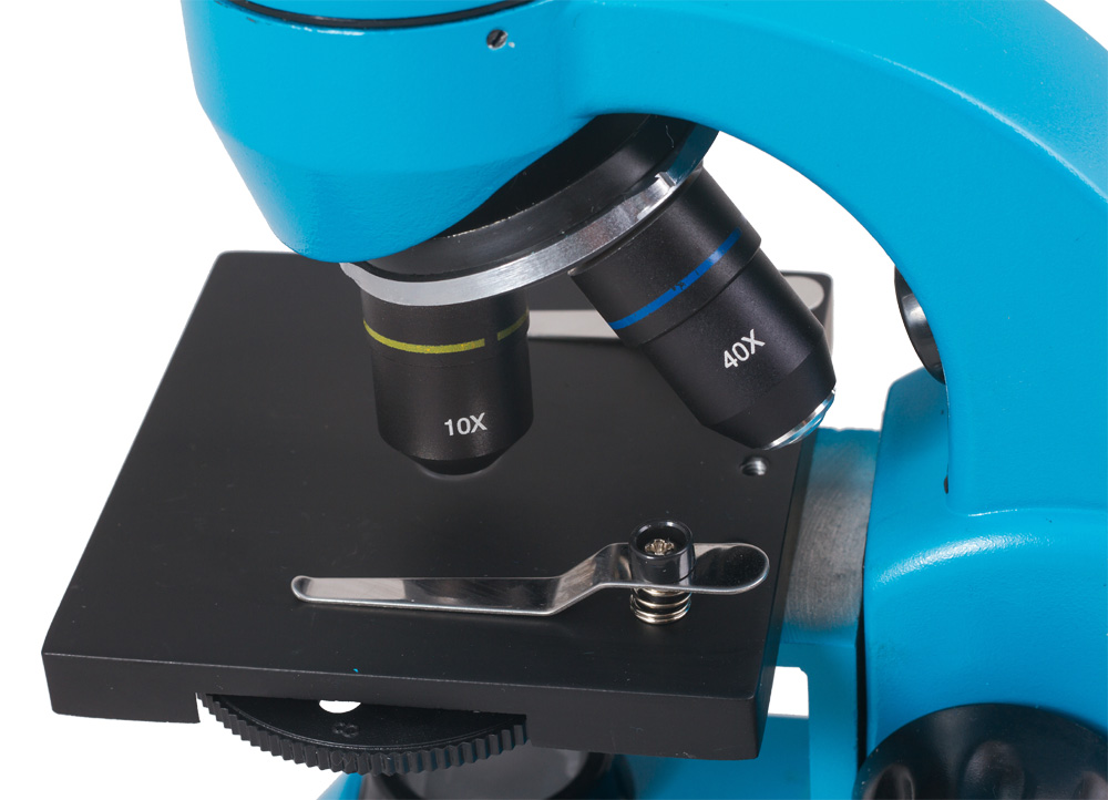Три объектива позволяют получить увеличения 64, 160 и 640 крат. В конструкции объектива 40xs использован пружинный механизм. Если при фокусировке неосторожно коснуться препарата объективом, он отодвинется, а оптика и покровное стекло останутся невредимыми. В комплект входит двукратная линза Барлоу, которая удваивает кратность микроскопа с каждым объективом. Таким образом, максимальное увеличение достигает 1280 крат.