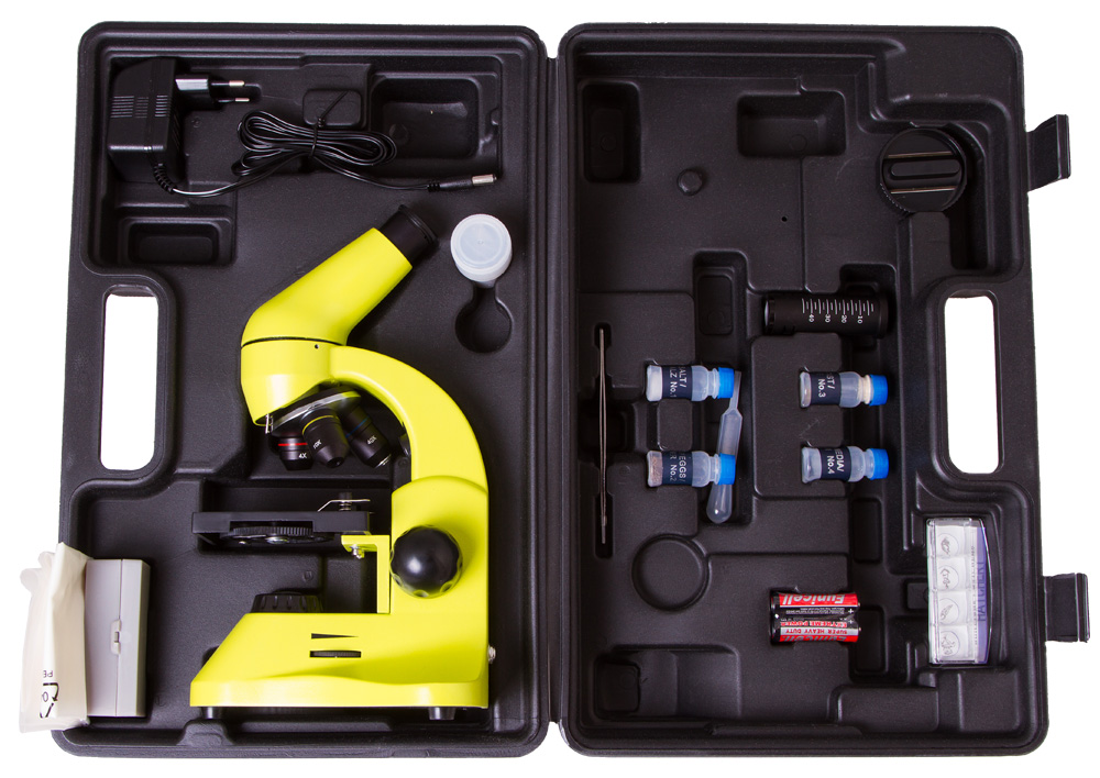 Микроскоп поставляется в надежном пластиковом кейсе – в нем части прибора не потеряются и не сломаются. Чтобы микроскоп не пылился, хранить его тоже рекомендуется в кейсе.