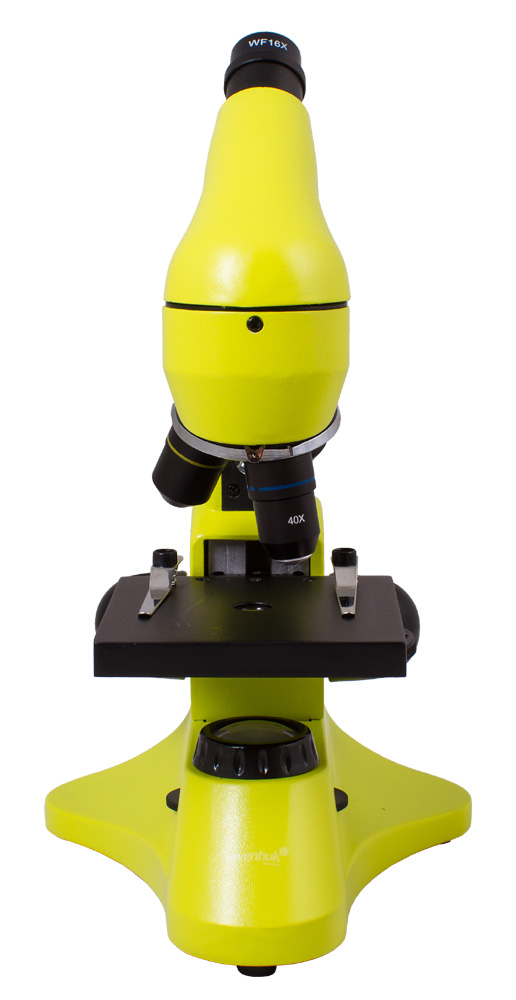 Три объектива позволяют получить увеличения 64, 160 и 640 крат. В конструкции объектива с наибольшим увеличением (40xs) использован пружинный механизм. Если при фокусировке неосторожно задеть объективом препарат, объектив отодвинется и не сломается. Покровное стекло тоже останется целым. Микроскоп комплектуется качественной линзой Барлоу, которая удваивает кратность прибора с каждым объективом. Максимальное увеличение при этом достигает 1280 крат!
