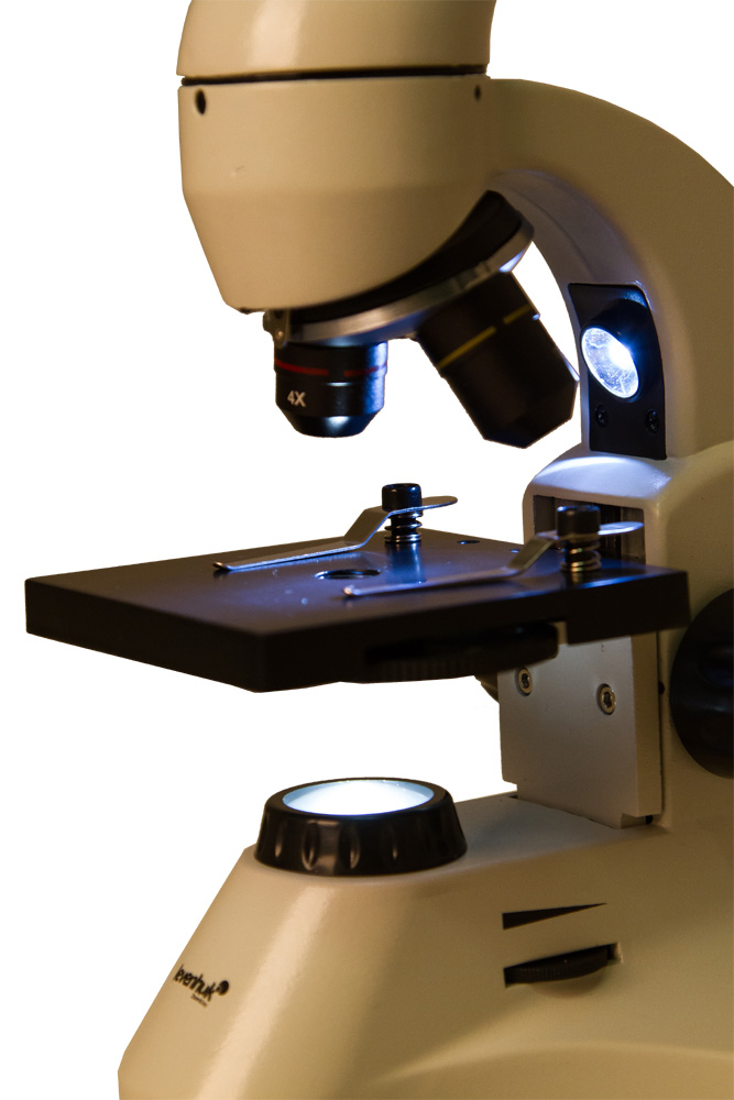 Микроскоп снабжен двумя яркими светодиодными осветителями. Чтобы изучить тонкий срез комнатного растения, шерсть домашний животных, кристалл соли или другие прозрачные объекты, нужно включить нижнюю подсветку. Верхний осветитель используется для работы с непрозрачными образцами, например монетами или бумагой. Полупрозрачные препараты хорошо различимы, когда оба осветителя включены одновременно. Яркость подсветки регулируется, так что для каждого препарата легко подобрать подходящее освещение.