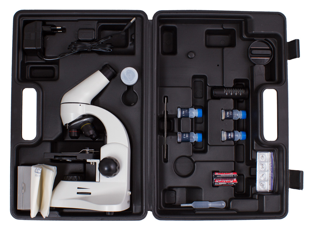 Чтобы части прибора не сломались и не потерялись при транспортировке, микроскоп поставляется в надежном кейсе из прочного пластика. Для защиты от пыли хранить микроскоп тоже лучше в кейсе.