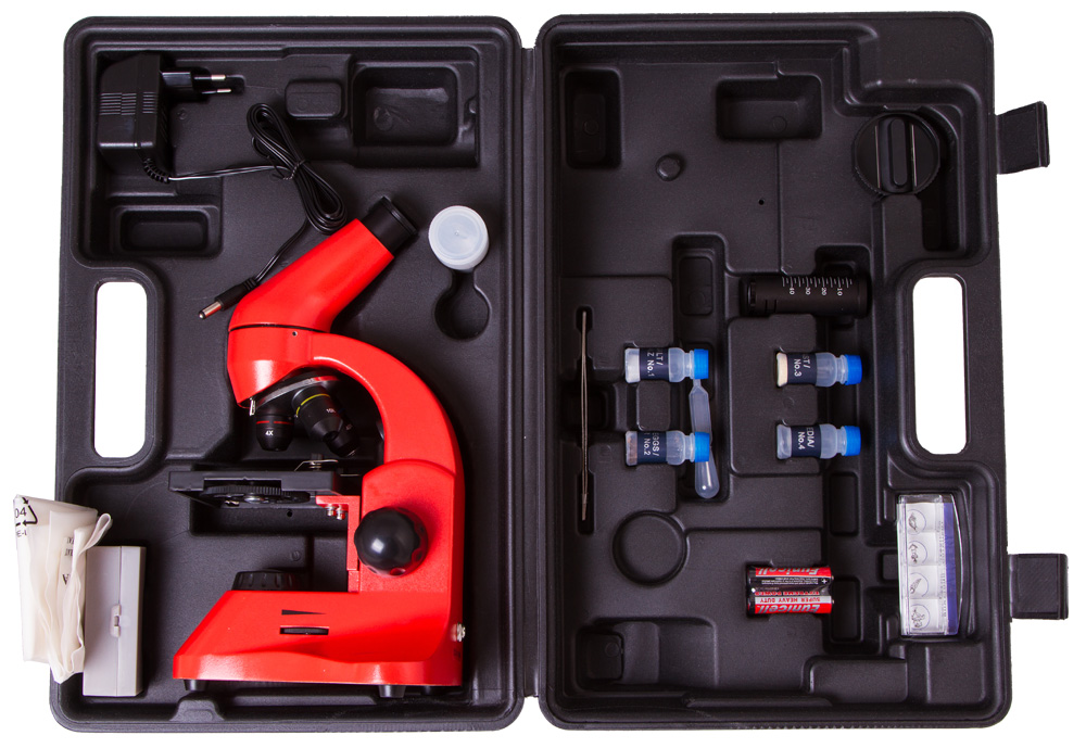 В комплект входит надежный пластиковый кейс – при хранении он защищает микроскоп от пыли, а при переноске – от механических повреждений.