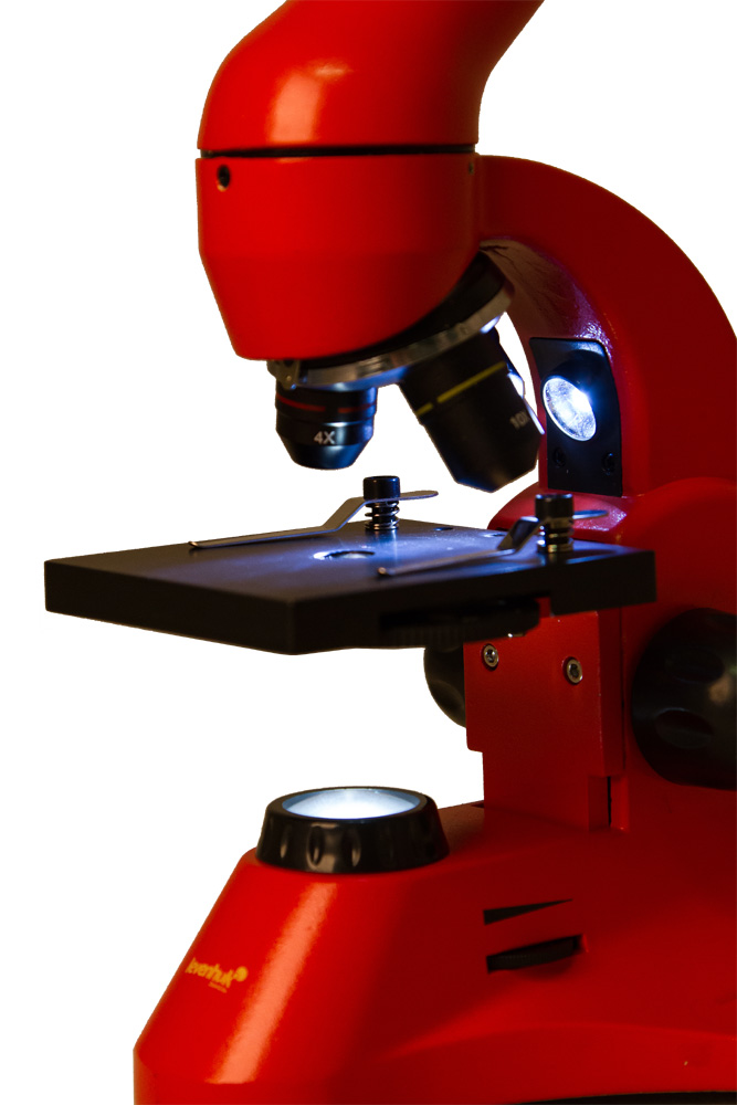 Микроскоп снабжен двумя яркими светодиодными осветителями. Нижняя подсветка нужна для исследования прозрачных препаратов, например кристаллов соли и сахара или тонких срезов растений. Чтобы рассмотреть на видимые невооруженным глазом волокна бумаги или другие непрозрачные объекты, включите верхний осветитель. Полупрозрачные препараты хорошо различимы, когда обе подсветки работают одновременно. Яркость регулируется, так что для каждого препарата легко подобрать оптимальное освещение.