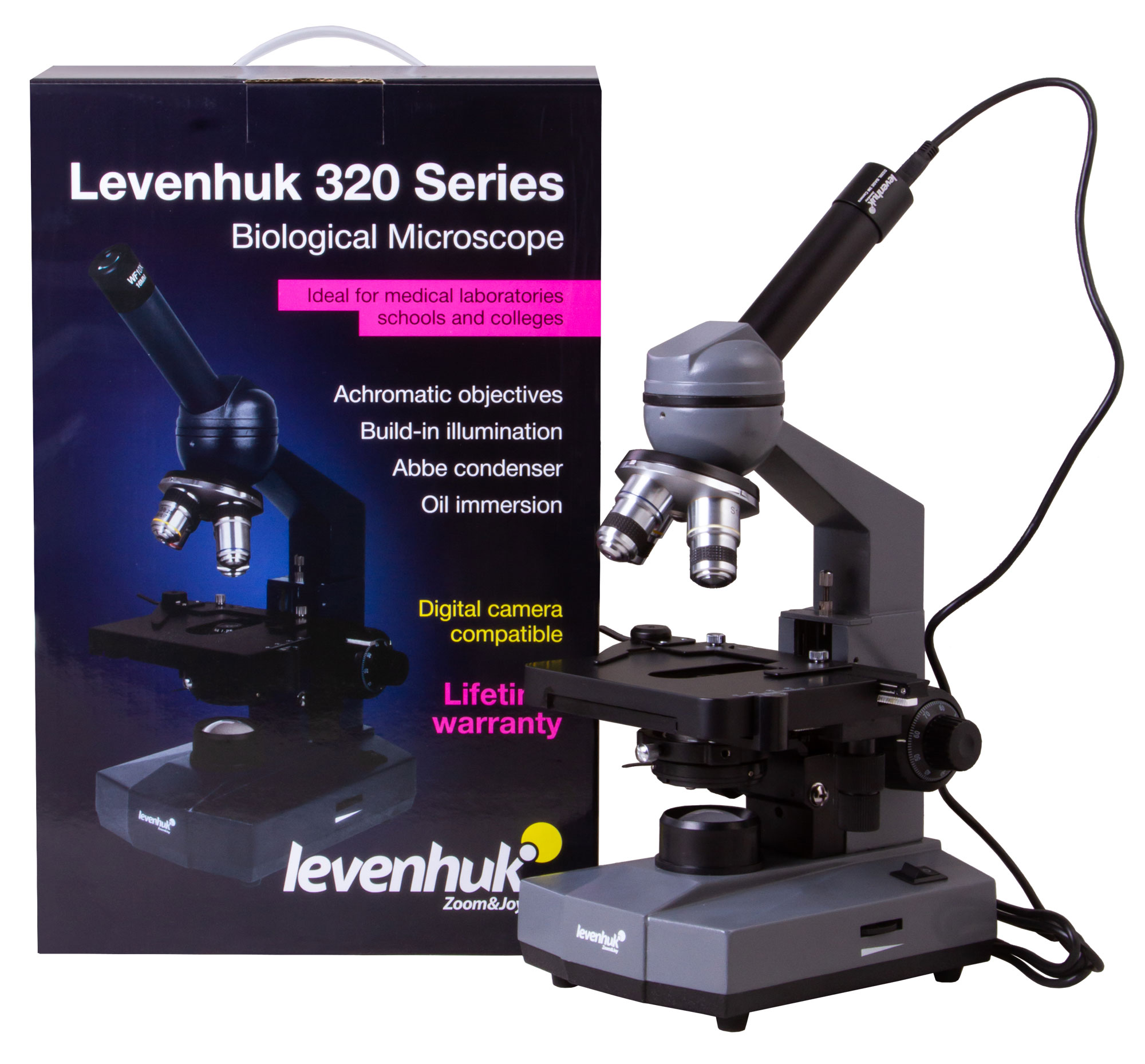 Микроскоп Levenhuk D320L BASE совместим с цифровыми камерами Levenhuk (камеры приобретаются отдельно). Камеры Levenhuk устанавливаются в окулярную трубку вместо окуляра.
