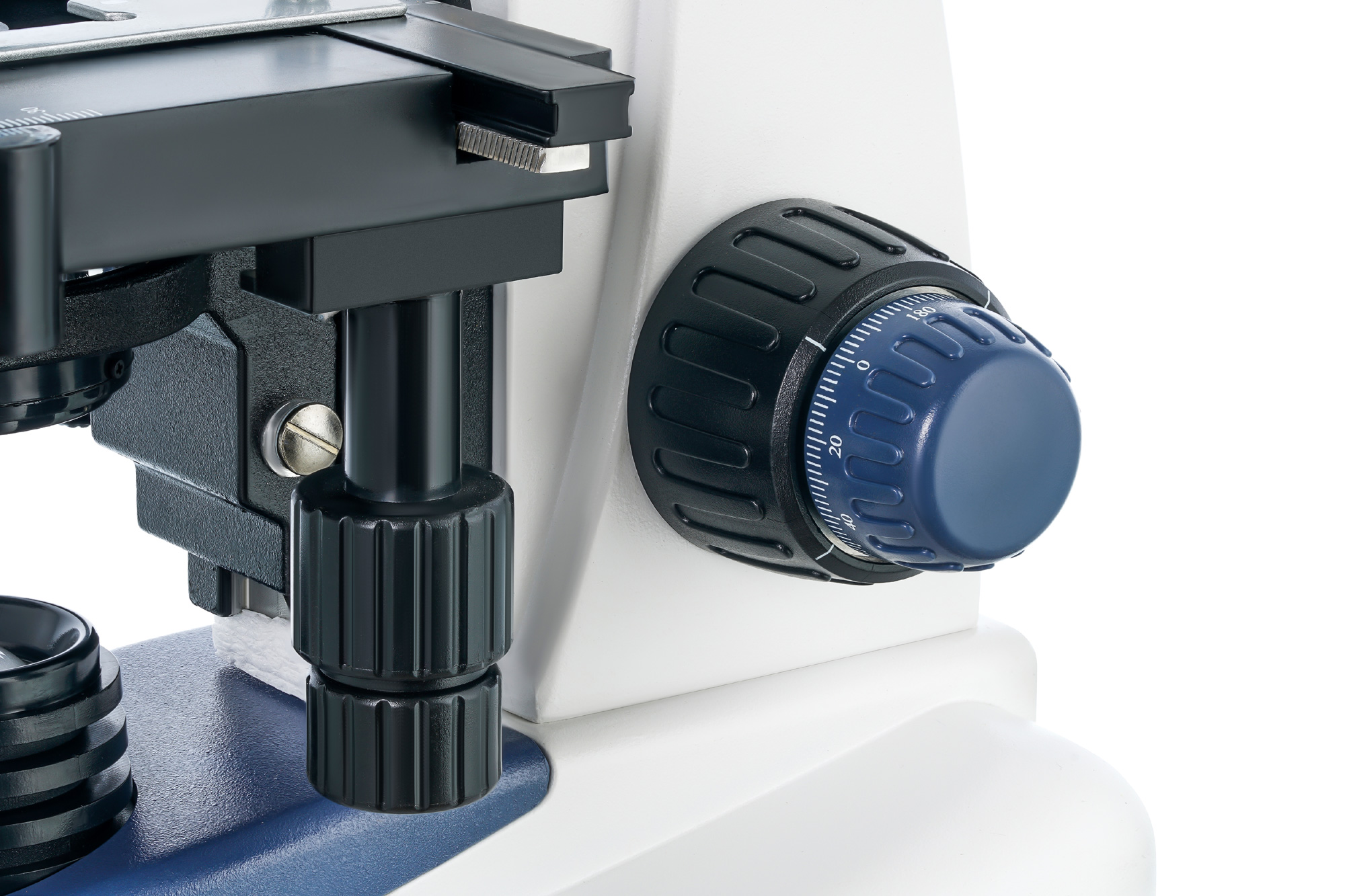 Под револьверным устройством расположен предметный столик с препаратоводителем. Ниже находится конденсор Аббе с ирисовой диафрагмой и держателем фильтра. Еще ниже – блок подсветки, а именно светодиод с коллектором. Подсветка работает от сети переменного тока, ее яркость можно регулировать.