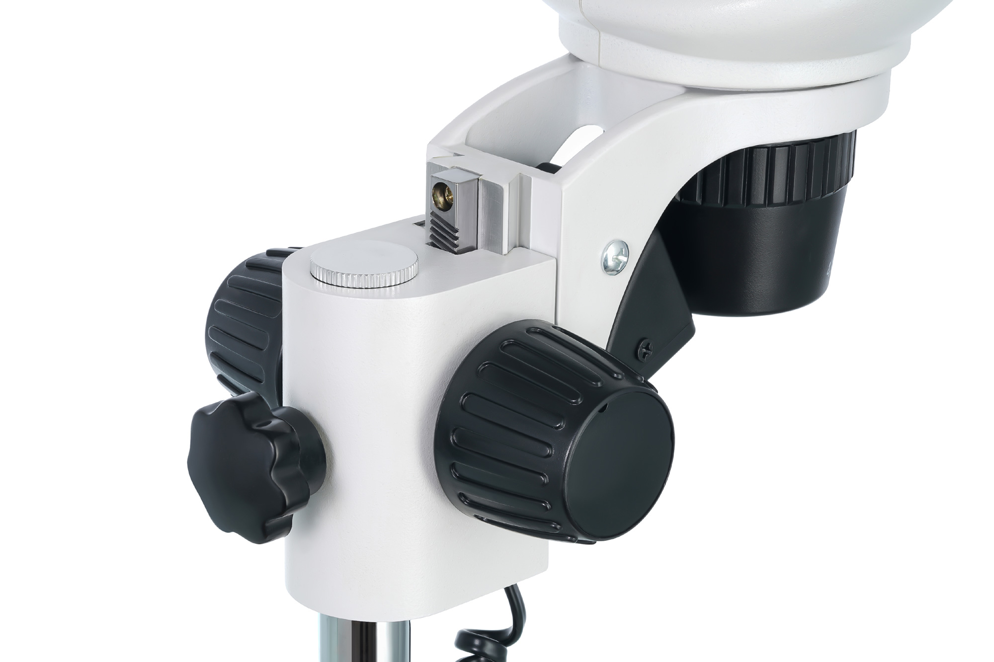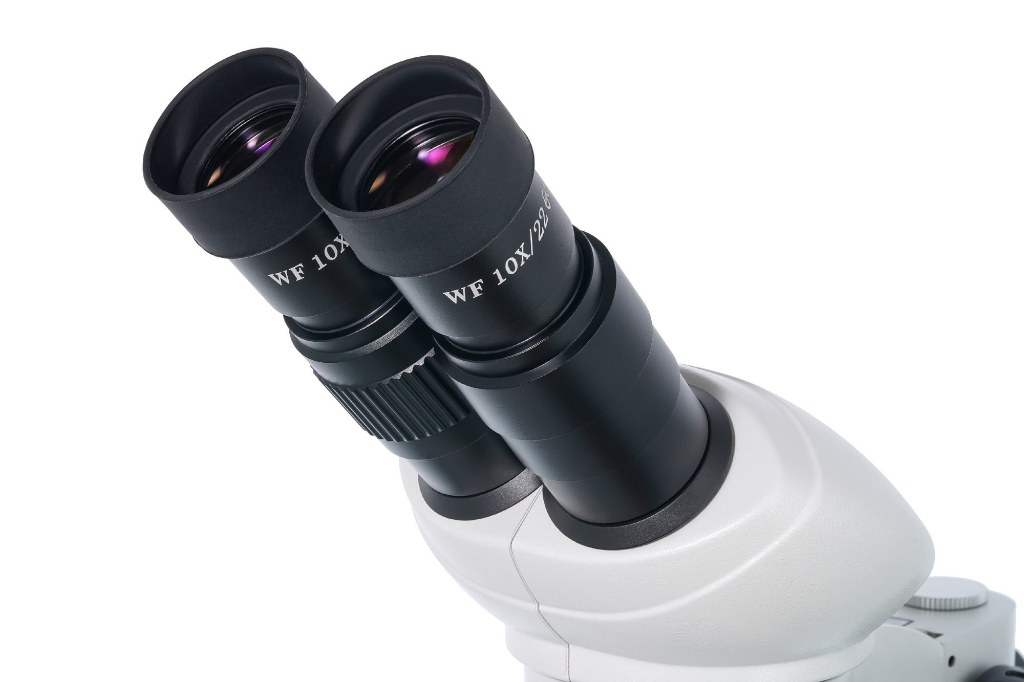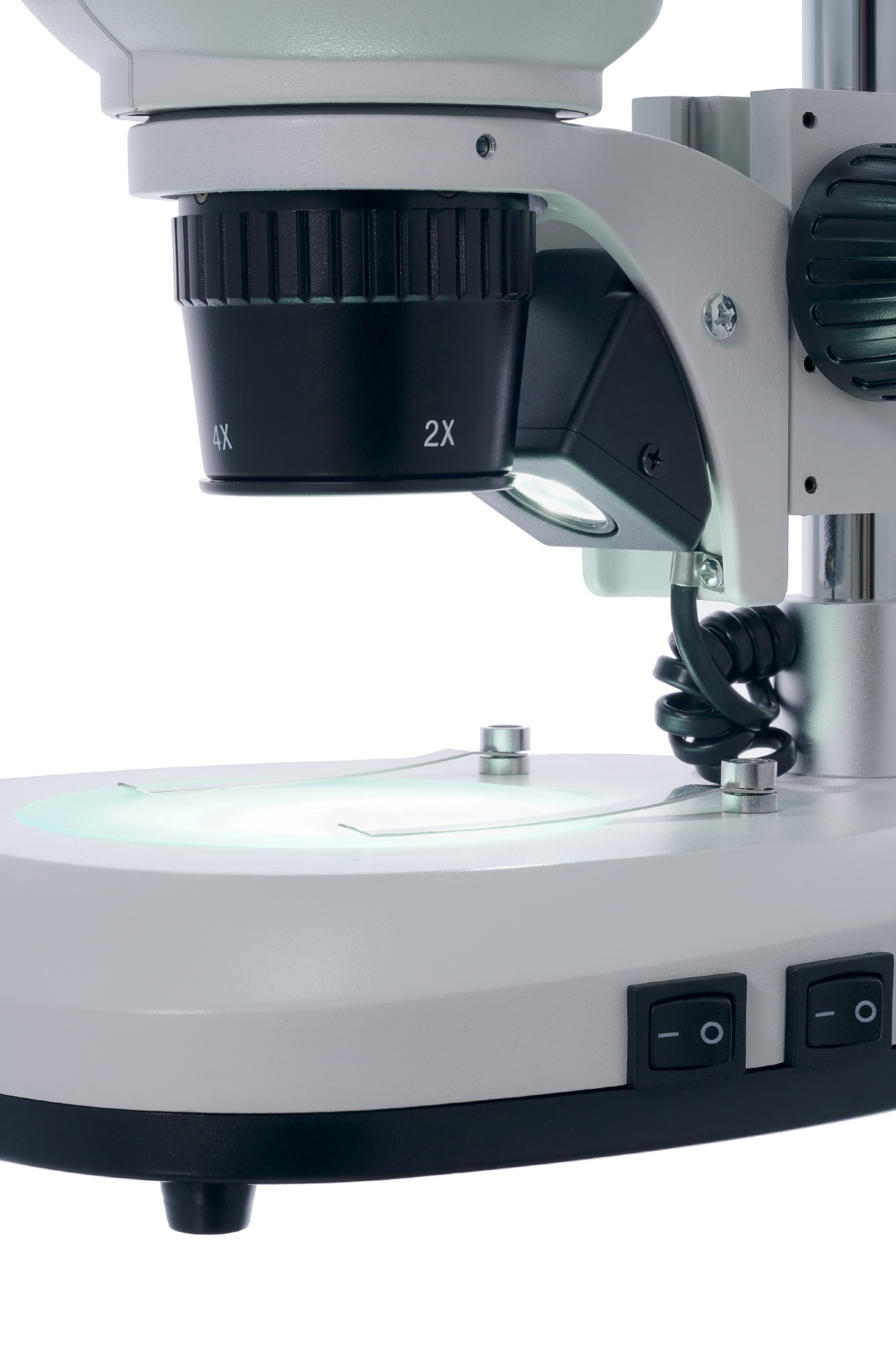 Оптика микроскопа сделана из стекла, объектив дает два увеличения – 2 и 4 крата, широкопольные окуляры приближают в 10 раз. Общий диапазон увеличений составляет от 20 до 40 крат. Есть грубая регулировка резкости. Бинокулярная насадка имеет небольшой наклон, что позволяет проводить длительные наблюдения с максимальным комфортом. При необходимости насадку можно вращать на 360°.