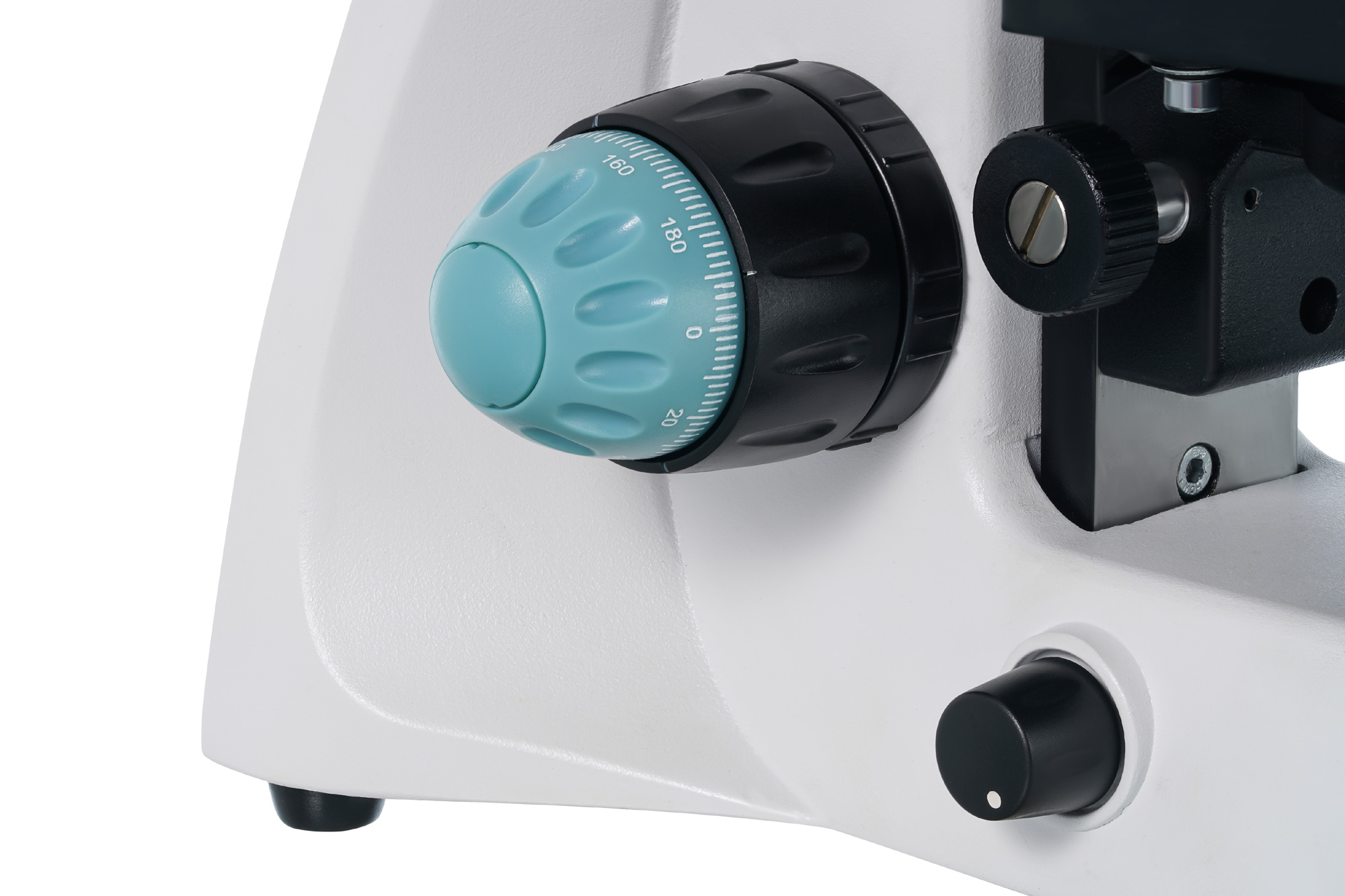 На предметный столик установлен препаратоводитель – он помогает быстро поместить образец точно под объективом. Под предметным столиком расположен светлопольный конденсор Аббе, высоту которого можно регулировать. Есть ирисовая диафрагма и держатель фильтра. Система освещения состоит из галогенной лампочки с коллектором, она мощная и создает равномерное и яркое освещение рабочей области. Яркость подсветки можно регулировать. Для питания используется сеть переменного тока.