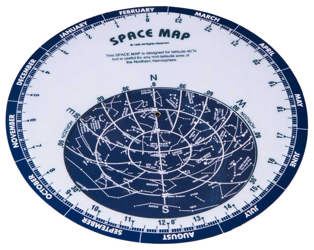 В комплект поставки входит планисфера – подвижная карта звездного неба. Она показывает, что можно увидеть на небосводе в определенное время суток в указанном месяце.