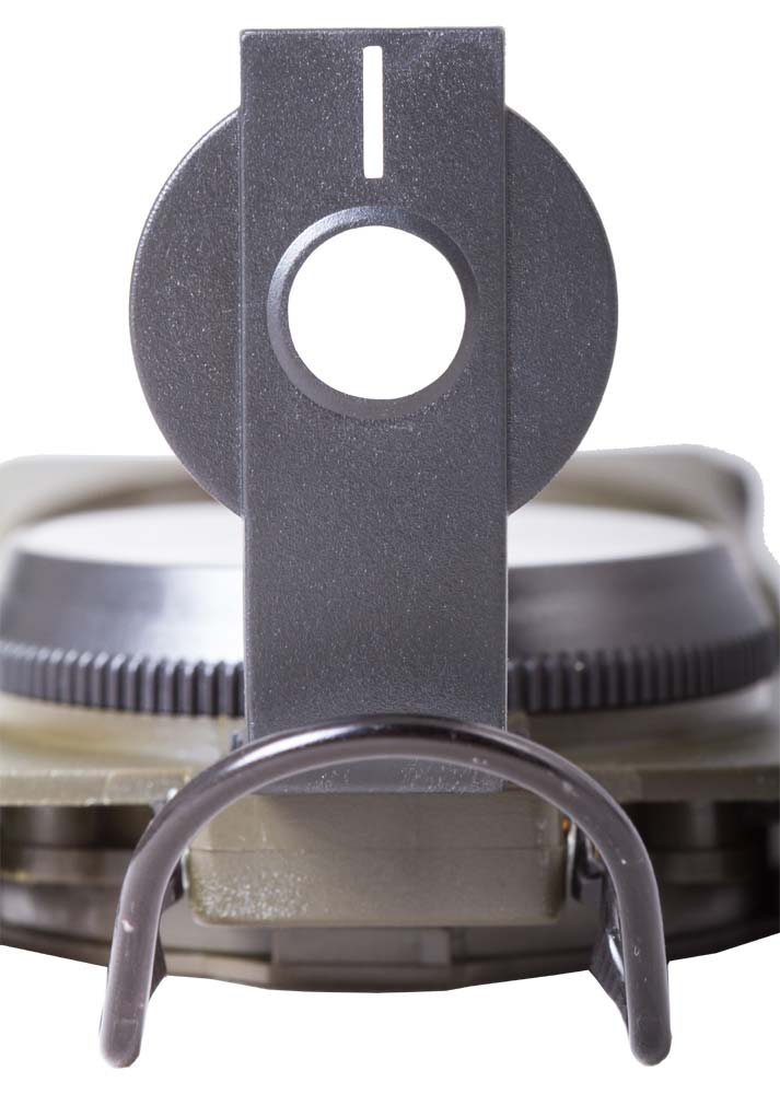 Удерживать направление на ориентир помогают увеличительная линза с мушкой и прицельная прорезь в крышке. На боковые грани корпуса нанесены масштабные линейки для карт. Есть скоба для надежного удержания компаса в руке.