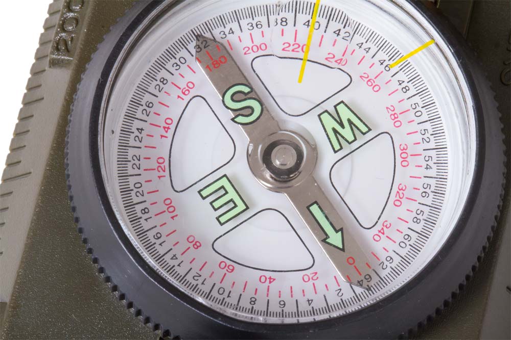 У Levenhuk DC65 плавающий циферблат, а значит, стрелка достигает равновесного состояния намного быстрее, чем в обычных компасах. На лимб нанесены две шкалы – в градусах и милах*. Обозначения сторон света крупные и четкие.