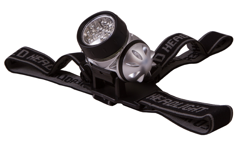 Фонарь работает от батареек (3 шт. типа ААА), источником света служат яркие светодиоды. Есть несколько режимов освещения, когда горят 1, 3 или 7 светодиодов одновременно. Переключаться между ними можно одной кнопкой. Фонарь фиксируется на голове – надежный тканевый ремешок регулируется по длине.