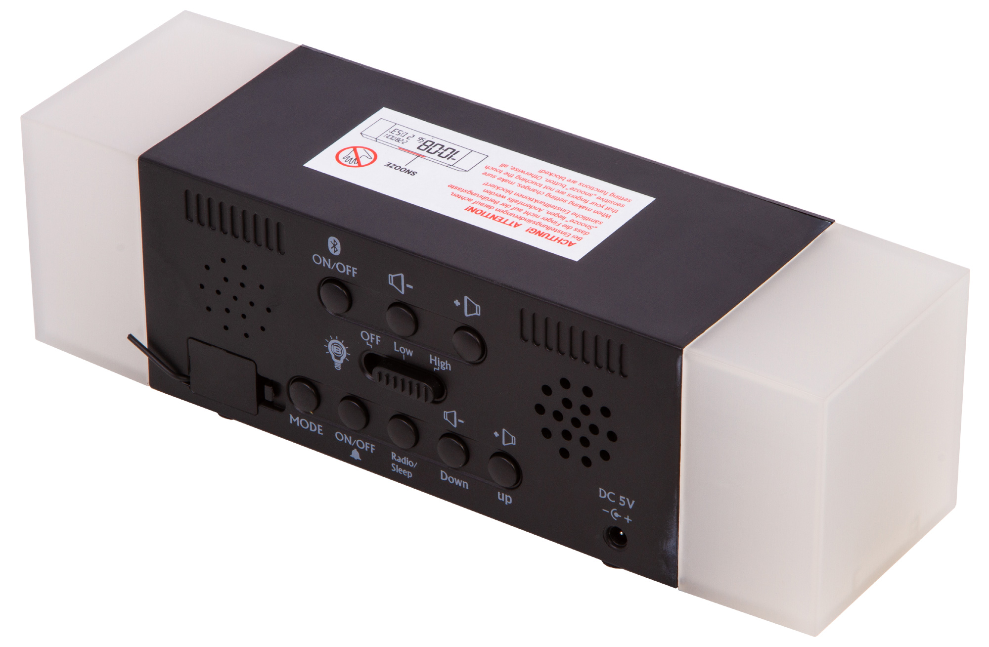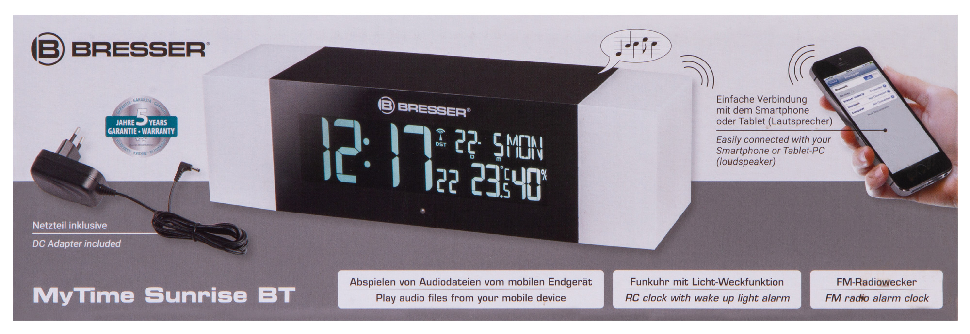 У прибора есть встроенный Bluetooth. Через беспроводное соединение к нему можно подключить смартфон, тогда Bresser MyTime Sunrise Bluetooth будет проигрывать мелодию будильника, установленную на мобильном устройстве. Также в качестве сигнала будильника можно выбрать классический звуковой сигнал или любимую радиостанцию.