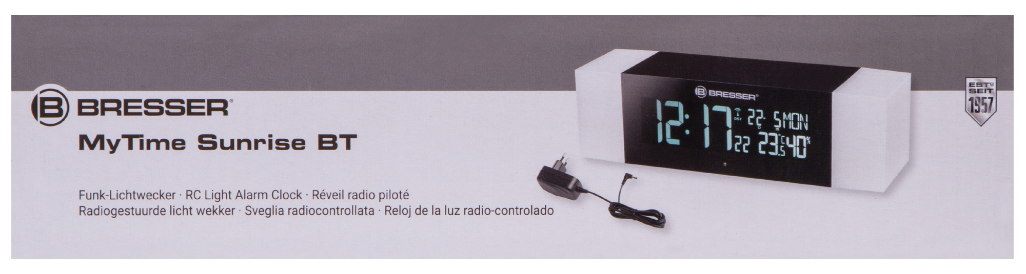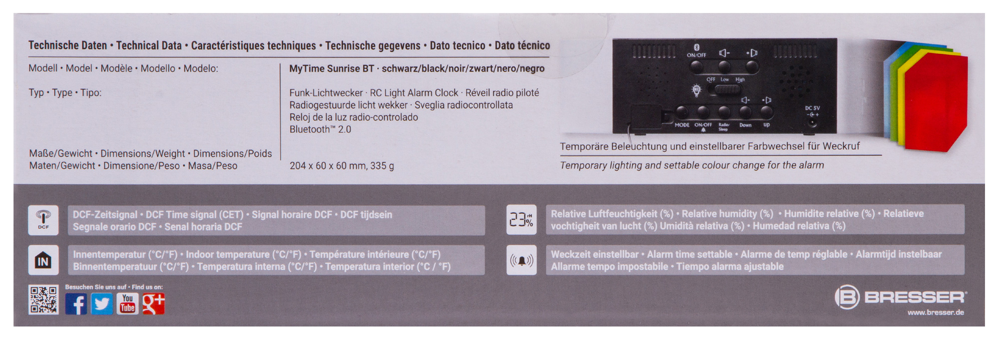 Bresser MyTime Sunrise Bluetooth – это многофункциональный прибор, который работает как классическое радио, часы с будильником и метеостанция, измеряющая температуру и влажность воздуха. Вся важная информация выводится на встроенный экран. Слева крупно показывается время, справа – дата, день недели и метеоданные. Боковые стенки прибора – это встроенная подсветка. Она может светить мягким приглушенным светом или окрашиваться в яркий насыщенный цвет. Режим работы подсветки можно выбрать.