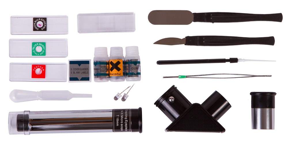 С помощью микроскопа можно изучать различные прозрачные объекты – это могут быть тонкий срез растения, капля воды из аквариума, крылышко мухи и многое другое. В комплекте есть готовые препараты и все, что нужно для проведения первых биологических опытов. Микроскоп поставляется с тремя объективами – он дает увеличения 75, 300 и 900 крат.