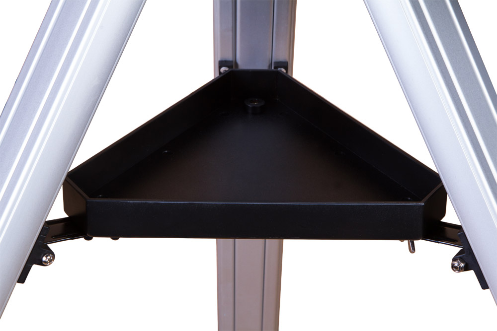Телескоп устанавливается на стандартную алюминиевую треногу. Она мало весит, прочно стоит на неровных поверхностях, может регулироваться под рост наблюдателя. Есть лоток для аксессуаров.