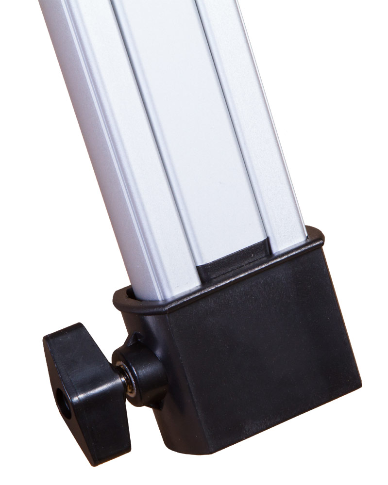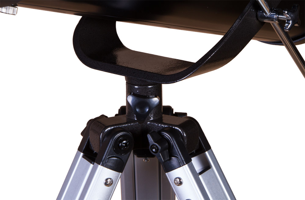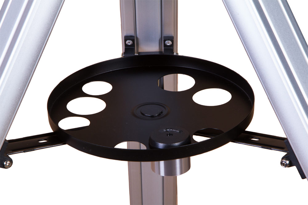 Оптическая труба установлена на классическую азимутальную монтировку. Ею легко управлять, на освоение требуется всего несколько минут. Монтировка, в свою очередь, устанавливается на алюминиевую треногу. Она устойчивая, надежная и регулируется по высоте. При необходимости на треногу можно установить лоток для аксессуаров, чтобы разместить на нем все необходимое для наблюдений. В комплект поставки включено два таких аксессуара – короткофокусный и длиннофокусный окуляры.