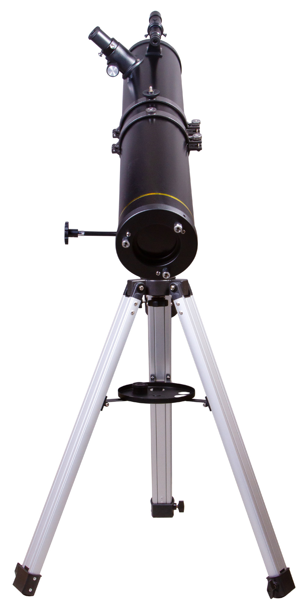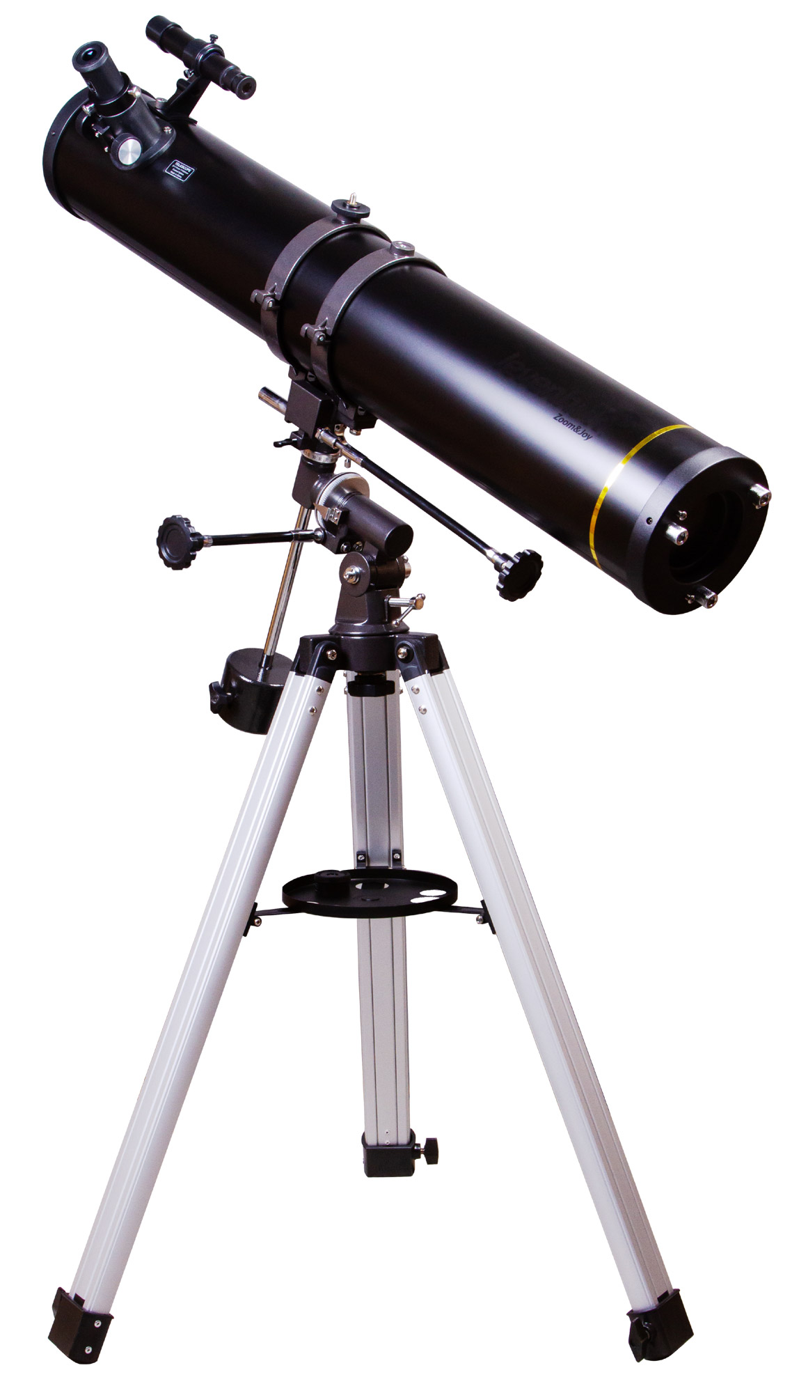 Все оптические элементы сделаны из стекла с просветлением. Труба установлена на экваториальную монтировку, для управления которой используются ручки тонких движений. Работа с ней требует определенного навыка, но на освоение не уйдет много времени. Телескоп подойдет не только опытным, но и начинающим астрономам. Алюминиевая тренога стоит устойчиво и надежно, высоту ее ножек можно регулировать. Есть лоток для аксессуаров.