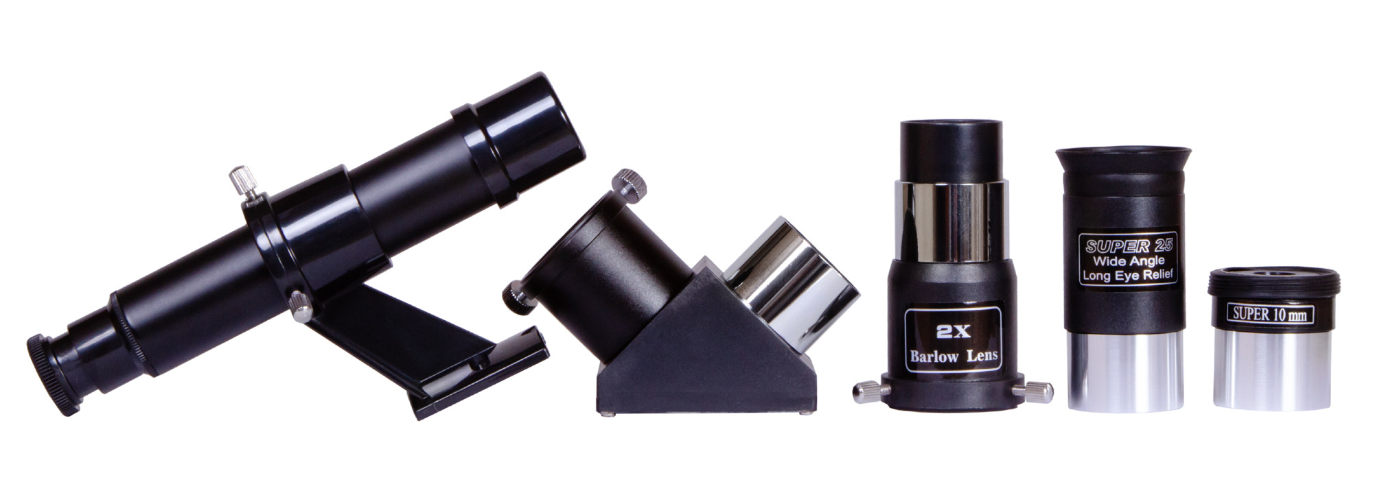 • Исчерпывающий набор оптических аксессуаров: два окуляра, линза Барлоу, диагональное зеркало