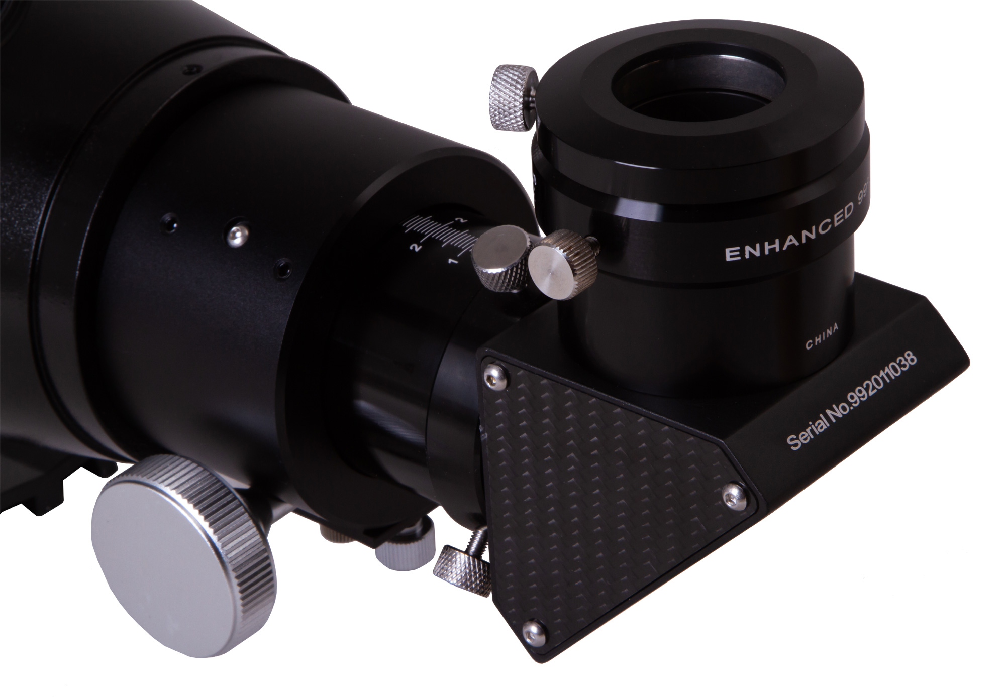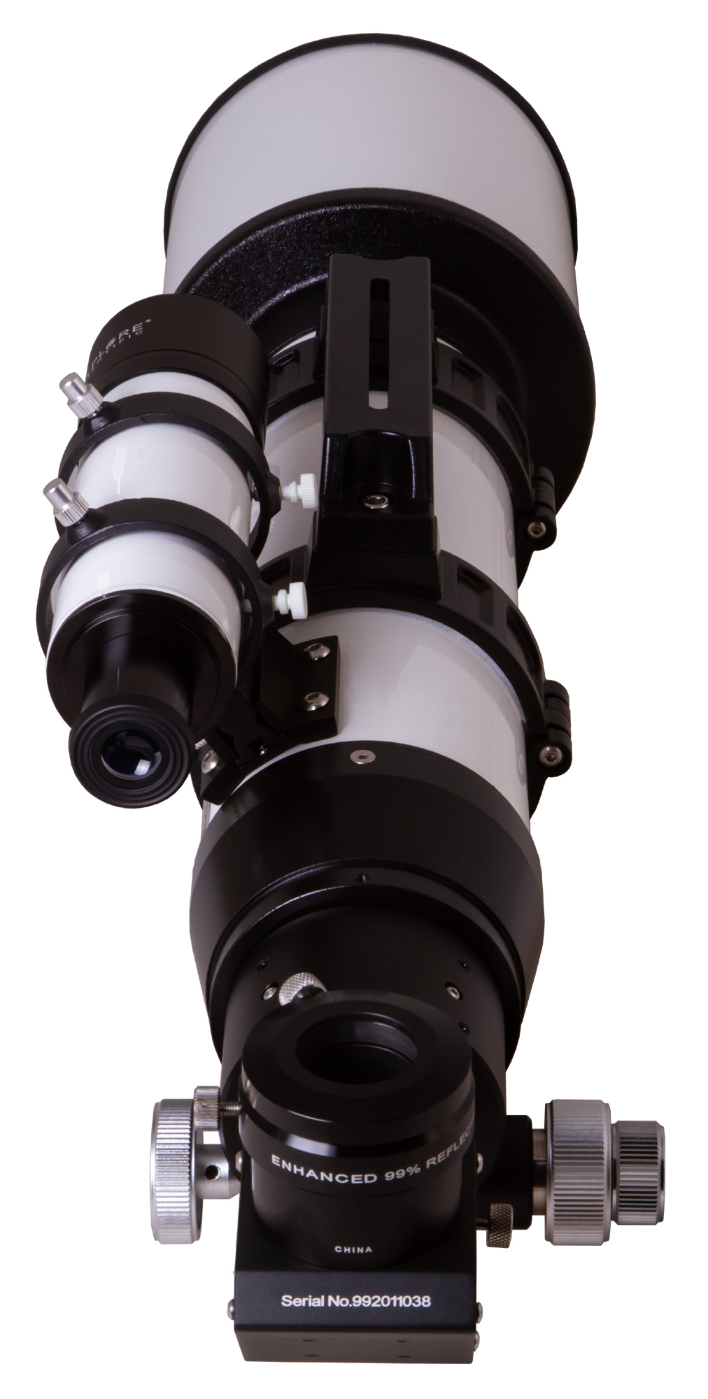 В оптической трубе установлен двухскоростной фокусер Крейфорда, который позволяет быстрее и точнее наводить резкость. У него плавный и ровный ход, что позволяет максимально эффективно контролировать процесс фокусировки. Для поиска объектов используется оптический искатель, который фиксируется надежным кронштейном с удобной регулировкой. Из оптических аксессуаров в комплект включено диагональное зеркало с высокой (99%) отражающей способностью. Зеркало позволяет устанавливать аксессуары с посадочным диаметром 1,25 и 2 дюйма.