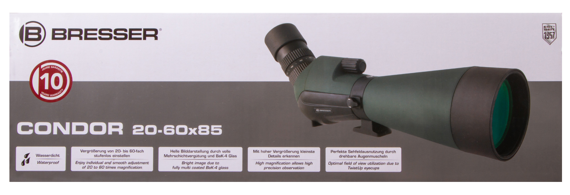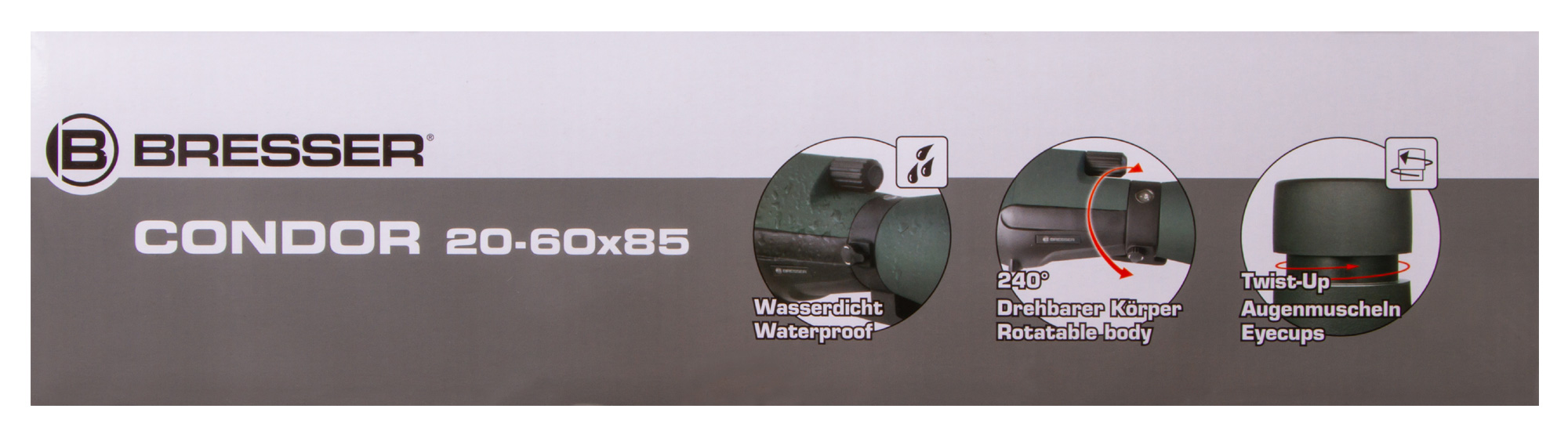 Bresser Condor 20–60x85 – зрительная труба со ступенчато изменяемым увеличением, которая прекрасно подходит для рассматривания как сильно удаленных объектов, так и протяженных областей. Это универсальный оптический прибор для наблюдений за спортивными мероприятиями, птицами и животными. Трубу можно устанавливать на стандартные штативы и монтировки, причем поворотный на 240° корпус позволяет размещать ее максимально удобно для наблюдателя.