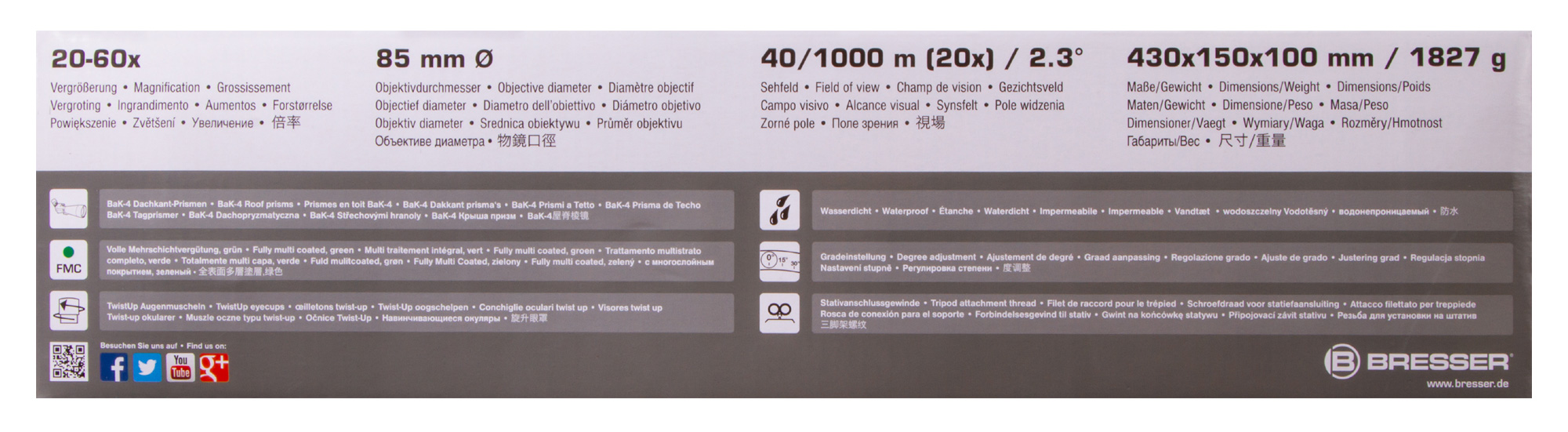 Зрительная труба адаптирована под пользователей, носящих очки. Окуляр имеет большой вынос выходного зрачка, а положение поворотно-выдвижного наглазника можно регулировать. К тому же на окуляре можно закрепить зеркальную камеру Nikon или Canon EOS (при помощи специального адаптера из ассортимента Bresser, который приобретается отдельно).